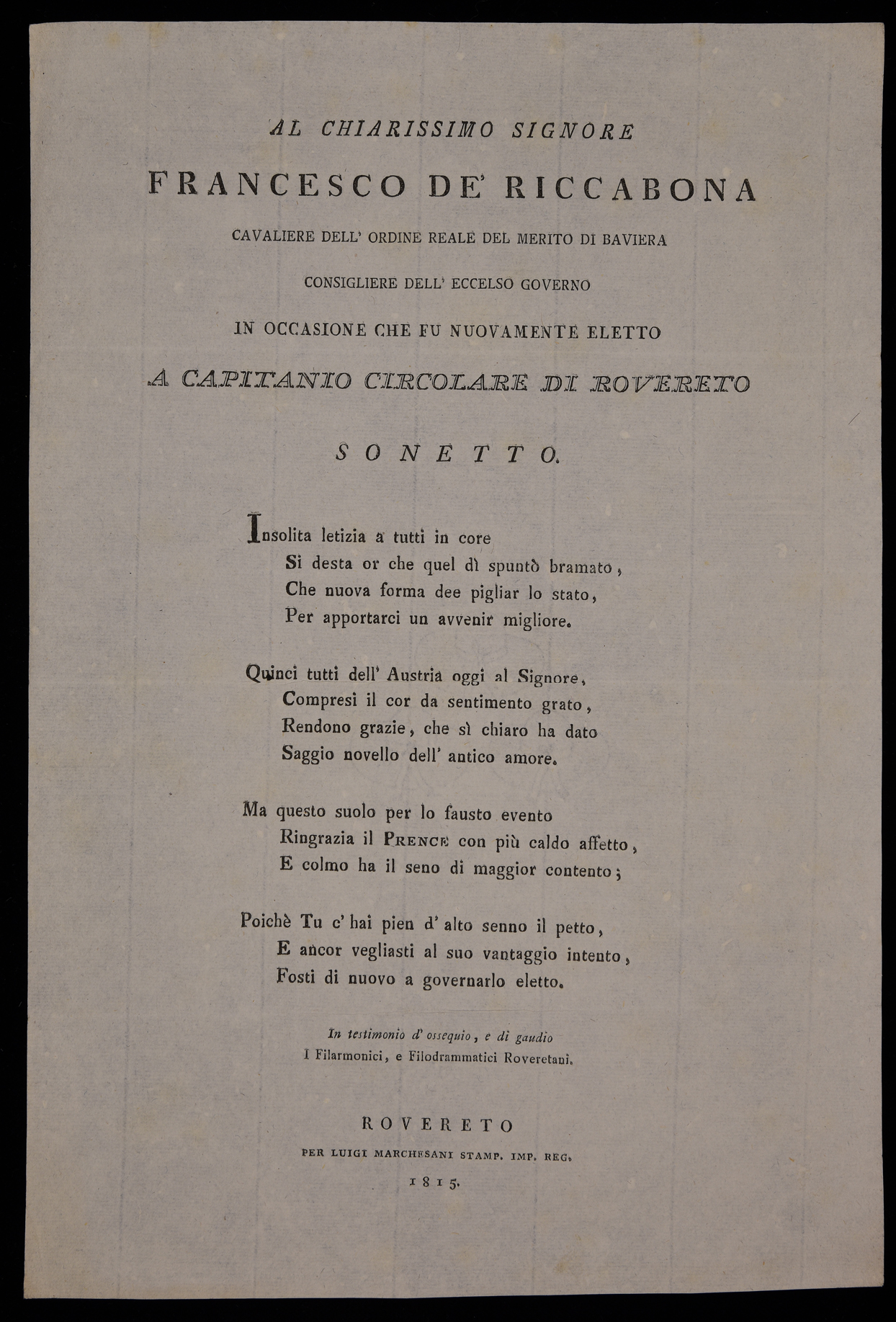 | Al chiarissimo signore Francesco de' Riccabona cavaliere dell'ordine reale del merito di Baviera ... sonetto |