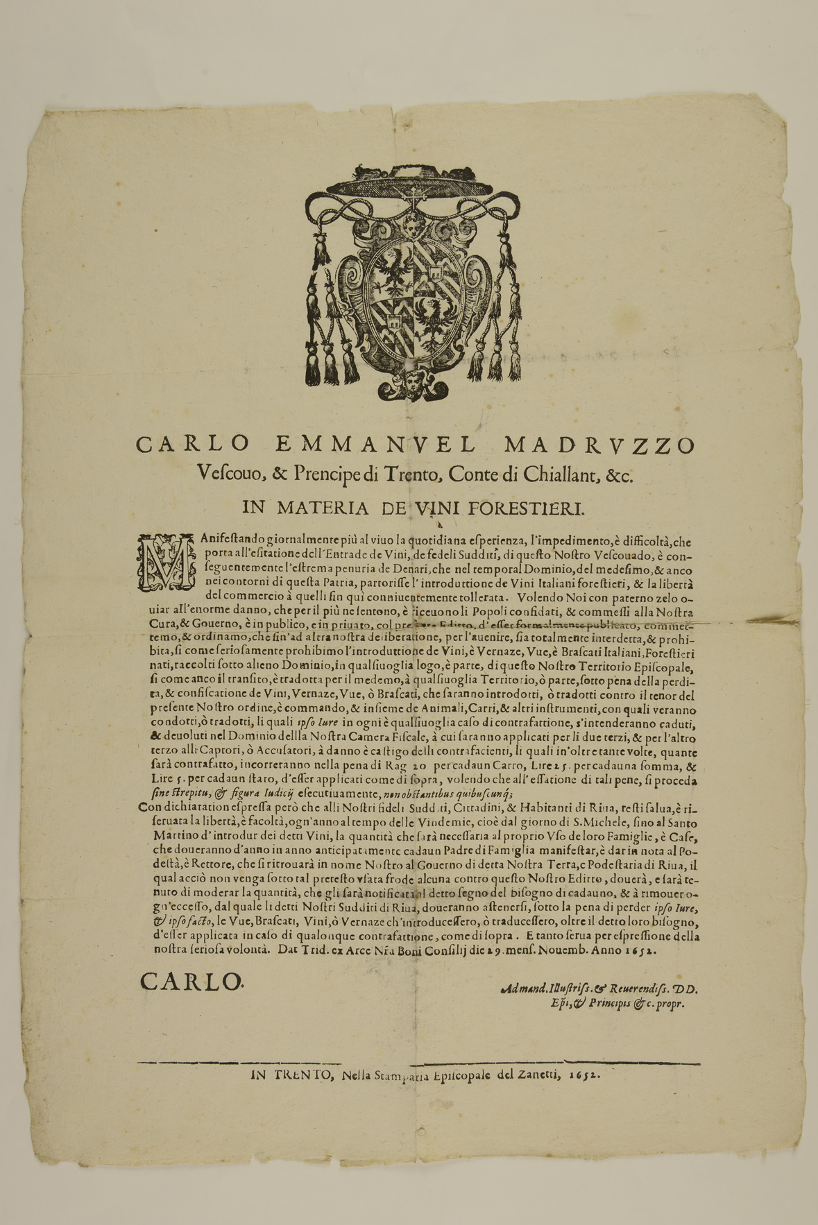 Proclama sui vini forestieri emanato il 29 novembre 1652 da Carlo Emmanuele Madruzzo, principe-vescovo di Trento