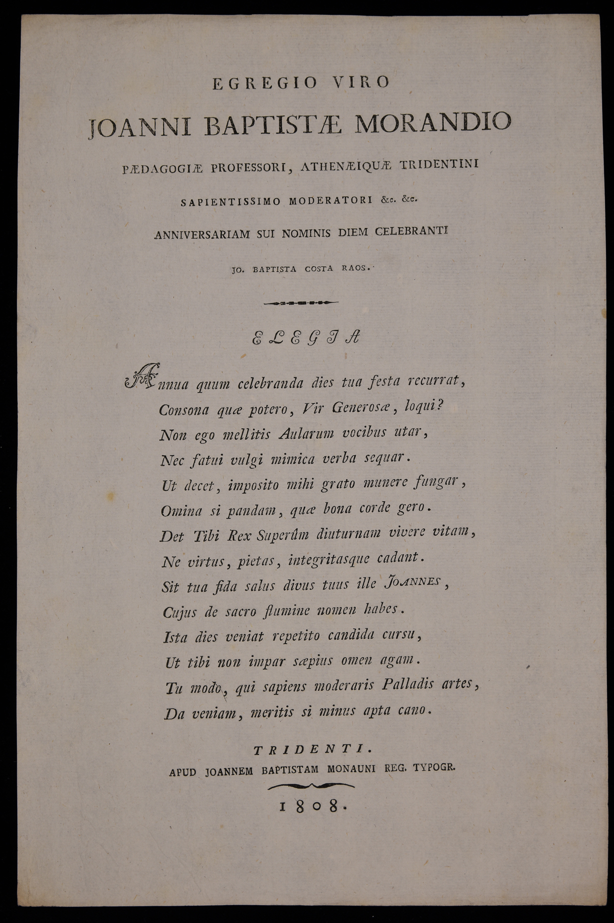 | Egregio viro Joanni Baptistae Morandio paedagogiae professori, athenaeiqae Tridentini sapientissimo moderatori &c. &c. anniversariam sui nominis diem celebranti Jo. Baptista Costa Raos, elegia |