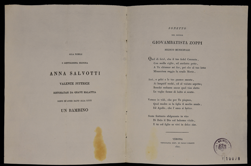 | Alla nobile e gentilissima signora Anna Salvotti valente pittrice ristoratasi da grave malattia dopo di aver dato alla luce un bambino |