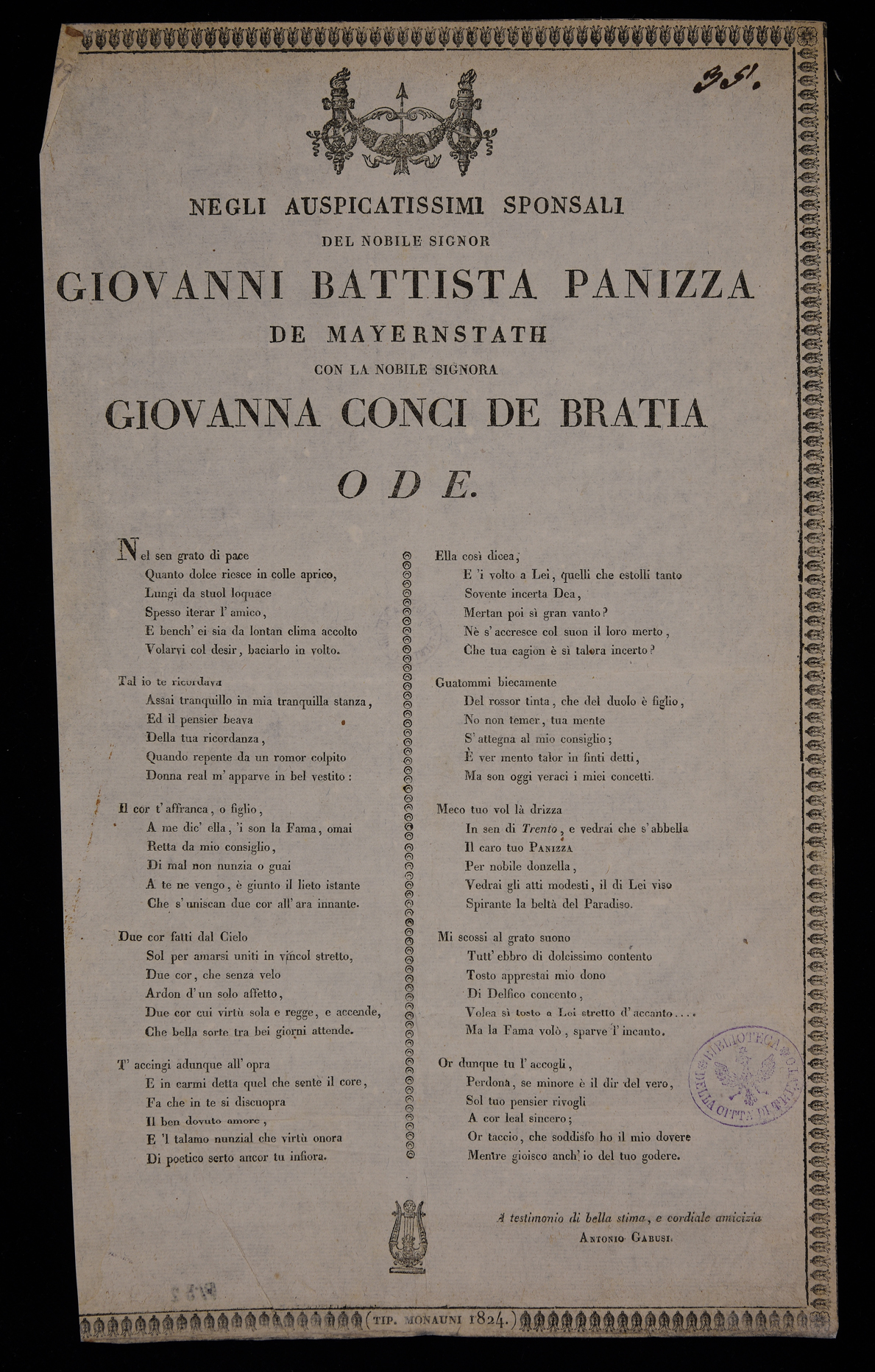 | Negli auspicatissimi sponsali del nobile signor Giovanni Battista Panizza de Mayernstath con la nobile signora Giovanna Conci de Bratia, ode |