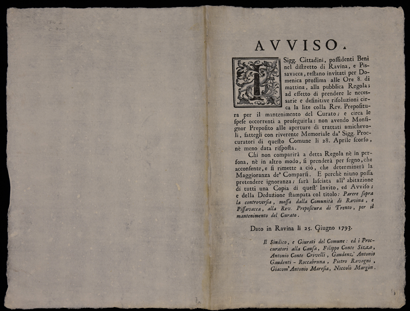 I sigg. cittadini, possidenti beni nel distretto di Ravina, e Pissavacca, restano invitati per domenica prossima ...