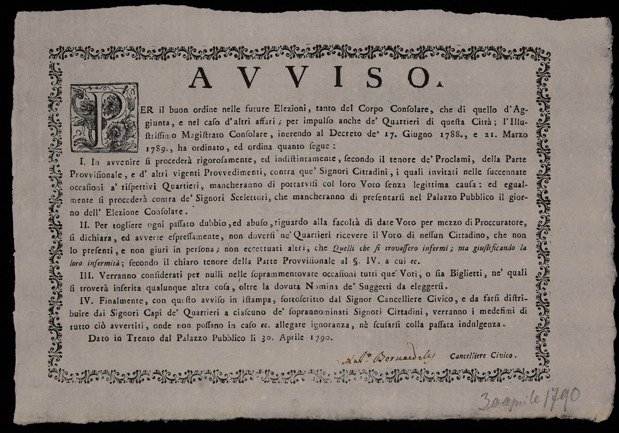 Proclama sull'elezione dei consoli emanato il 30 aprile 1790 dal Magistrato consolare di Trento, stampa attribuibile alla tipografia Battisti di Trento in base al raffronto di caratteri e fregi.
