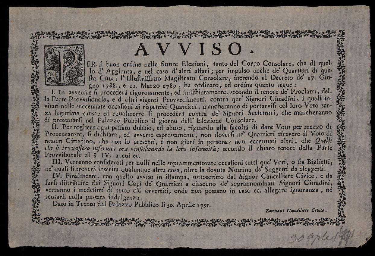 Proclama sull'elezione dei consoli emanato il 30 aprile 1791 dal Magistrato consolare di Trento, stampa attribuibile alla tipografia Battisti di Trento in base al raffronto di caratteri e fregi, stemma del Magistrato consolare di Trento.