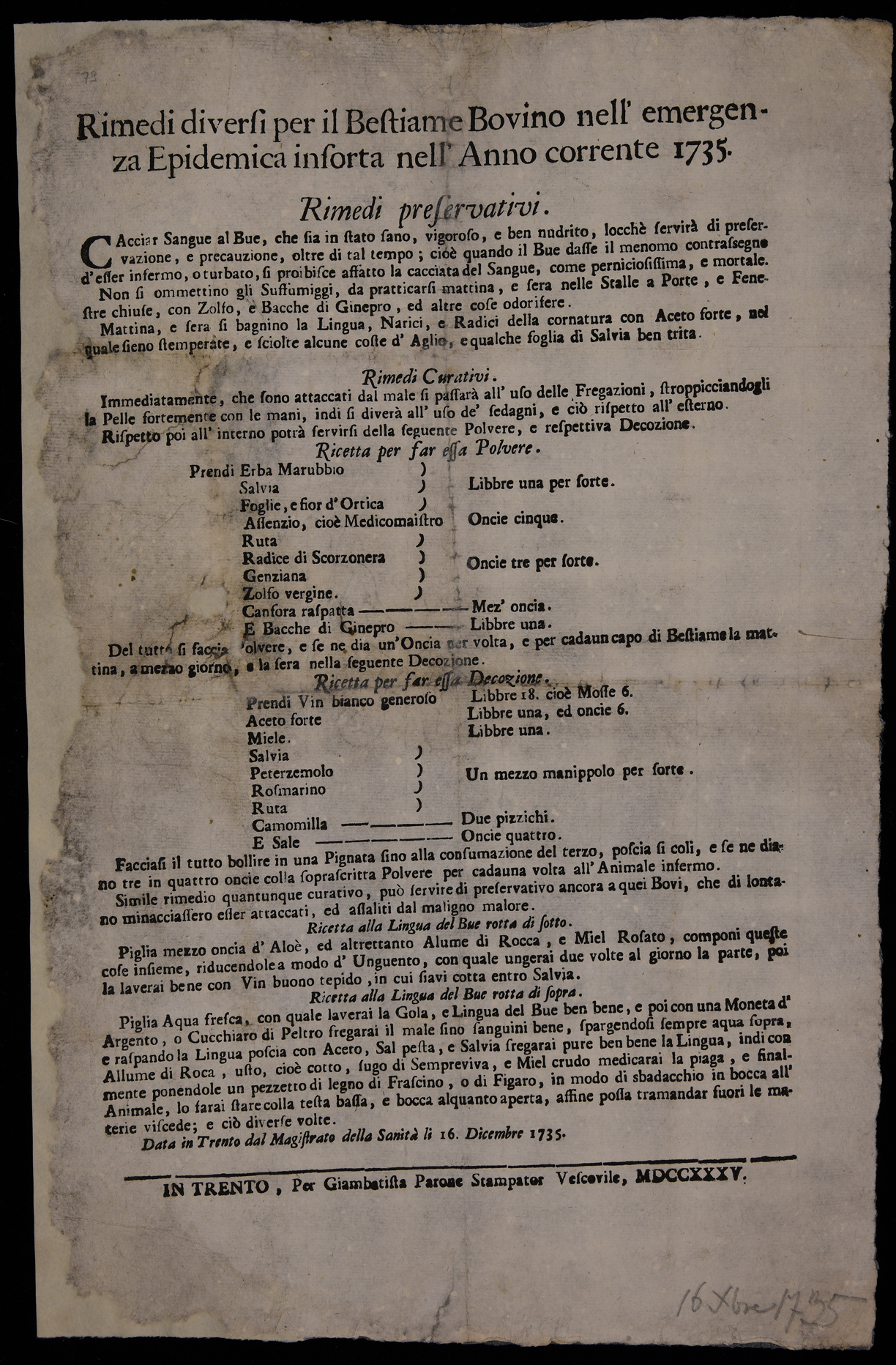 Proclama sulla prevenzione dei contagi bovini emanato il 16 dicembre 1735 dall’Ufficio della sanità della città di Trento