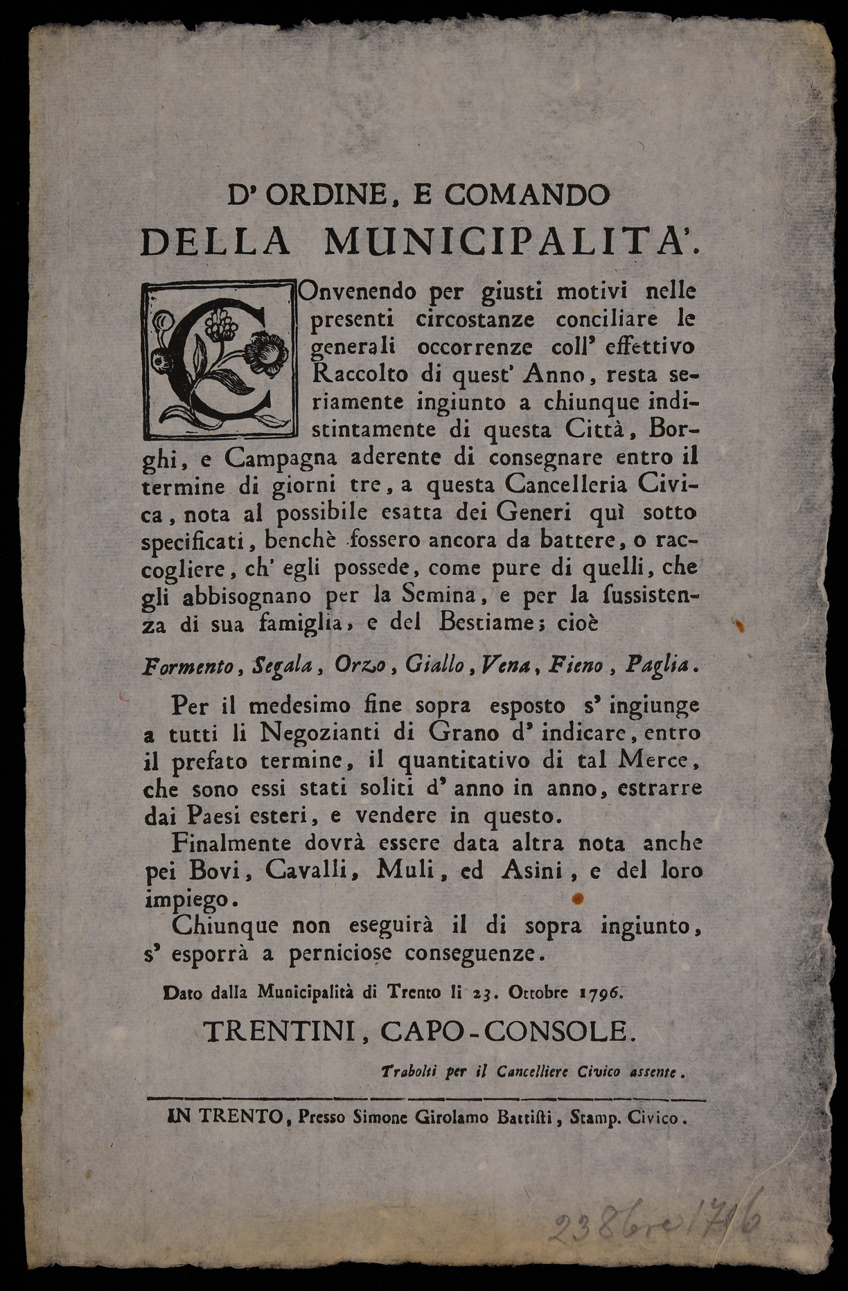Proclama sulla notificazione dei raccolti di granaglie e degli animali da tiro, emanato il 23 ottobre 1796 dal Magistrato consolare di Trento.