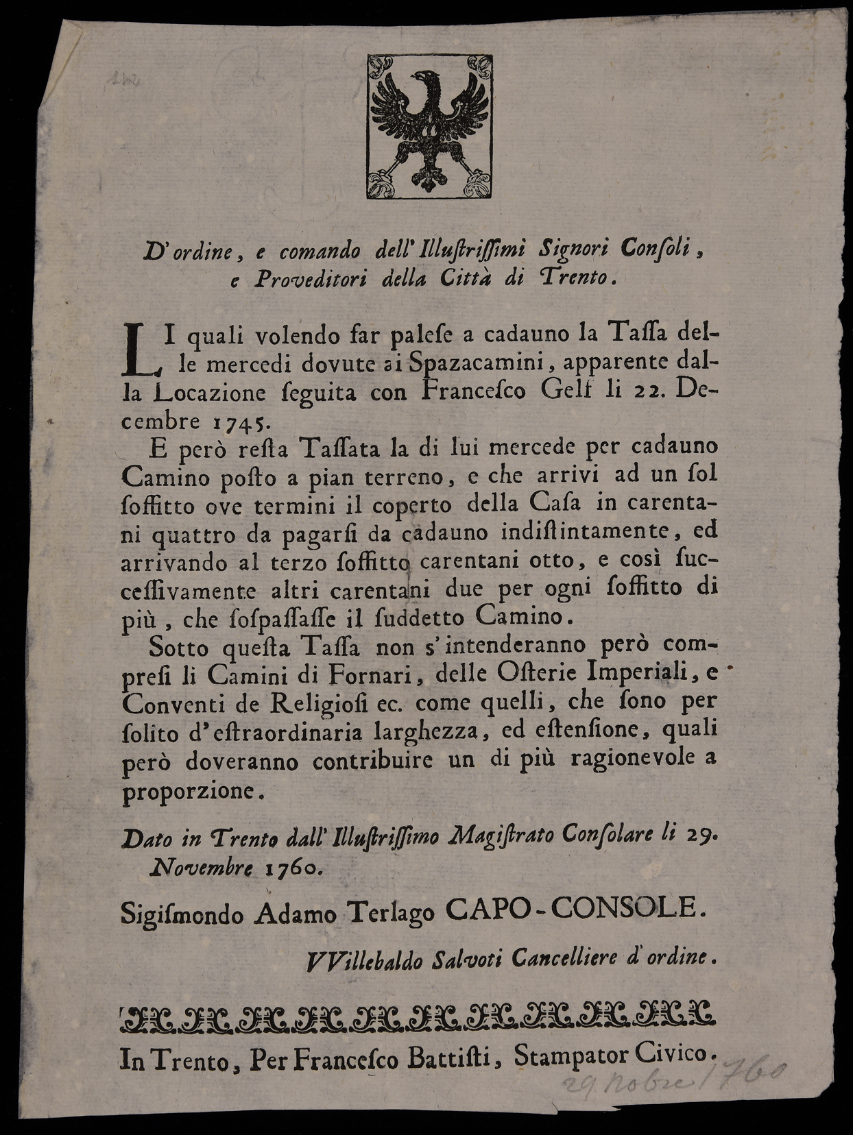 Proclama sul compenso agli spazzacamini emanato il 29 novembre 1760 dal Magistrato consolare di Trento, stemma del Magistrato consolare di Trento, sottoscritto da Sigismondo Adamo Terlago (capo console) e da Willebaldo Salvotti (cancelliere).