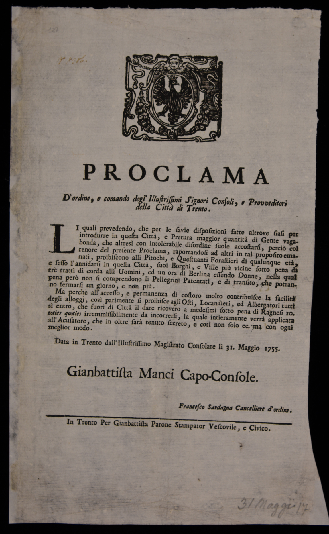 Proclama su mendicanti e vagabondi emanato il 31 maggio 1755 dal Magistrato consolare di Trento, stemma del Magistrato consolare di Trento, sottoscritto da Giambattista Manci (capo console) e da Francesco Sardagna (cancelliere).