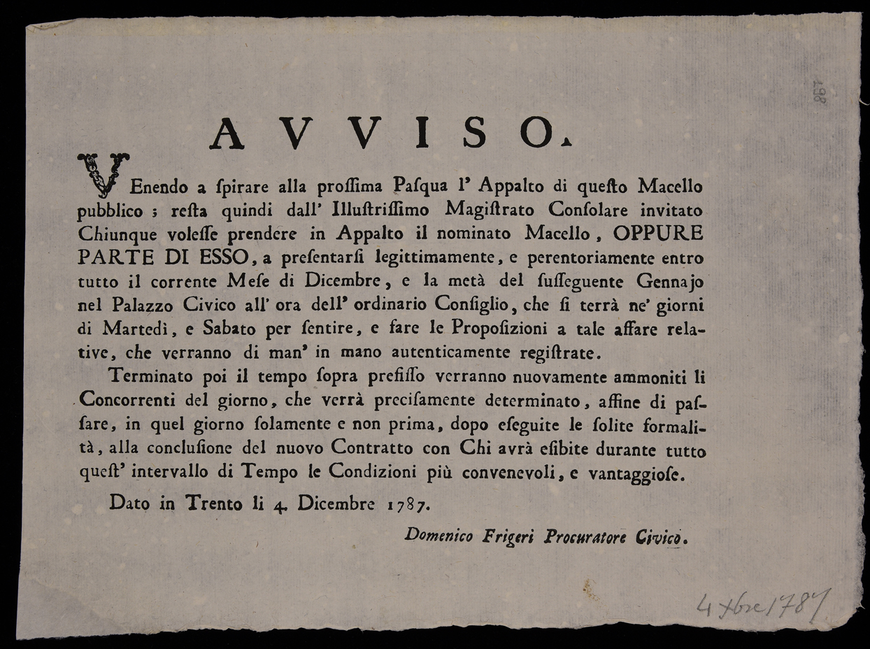 Proclama sull'appalto del macello emanato il 4 dicembre 1787 dal Magistrato consolare di Trento, stampa attribuibile alla tipografia Battisti di Trento in base al raffronto di caratteri e fregi.