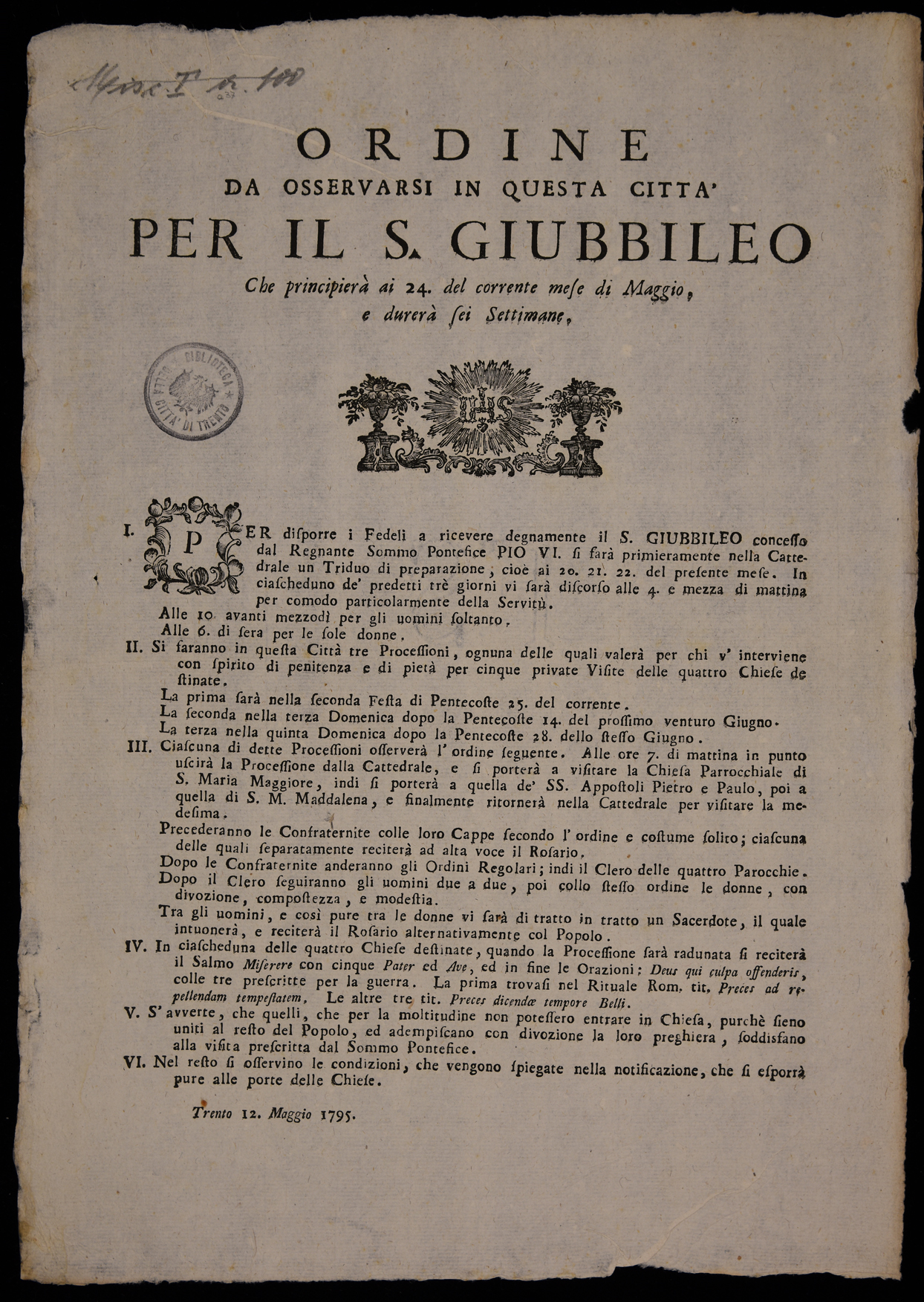 | Ordine da osservarsi in questa città per il s. giubbileo che principierà ai 24. del corrente mese di maggio e durerà sei settimane |