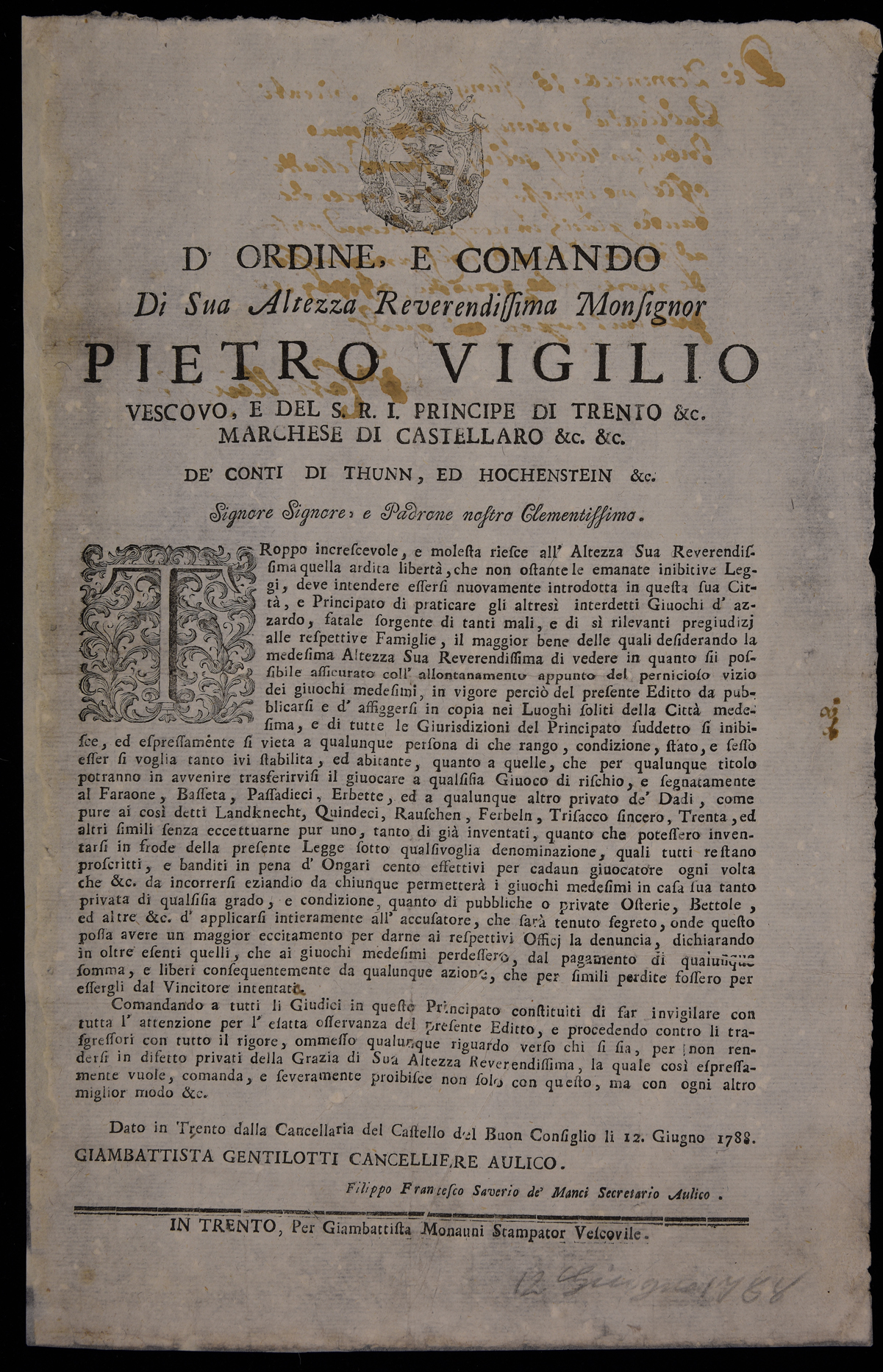 | D'ordine e comando di sua altezza reverendissima monsignor Pietro Vigilio vescovo e del S.R.I. principe di Trento &c. marchese di Castellaro &c. &c. de' conti di Thunn, ed Hochestein &c. signore signore, e padrone nostro clementissimo |