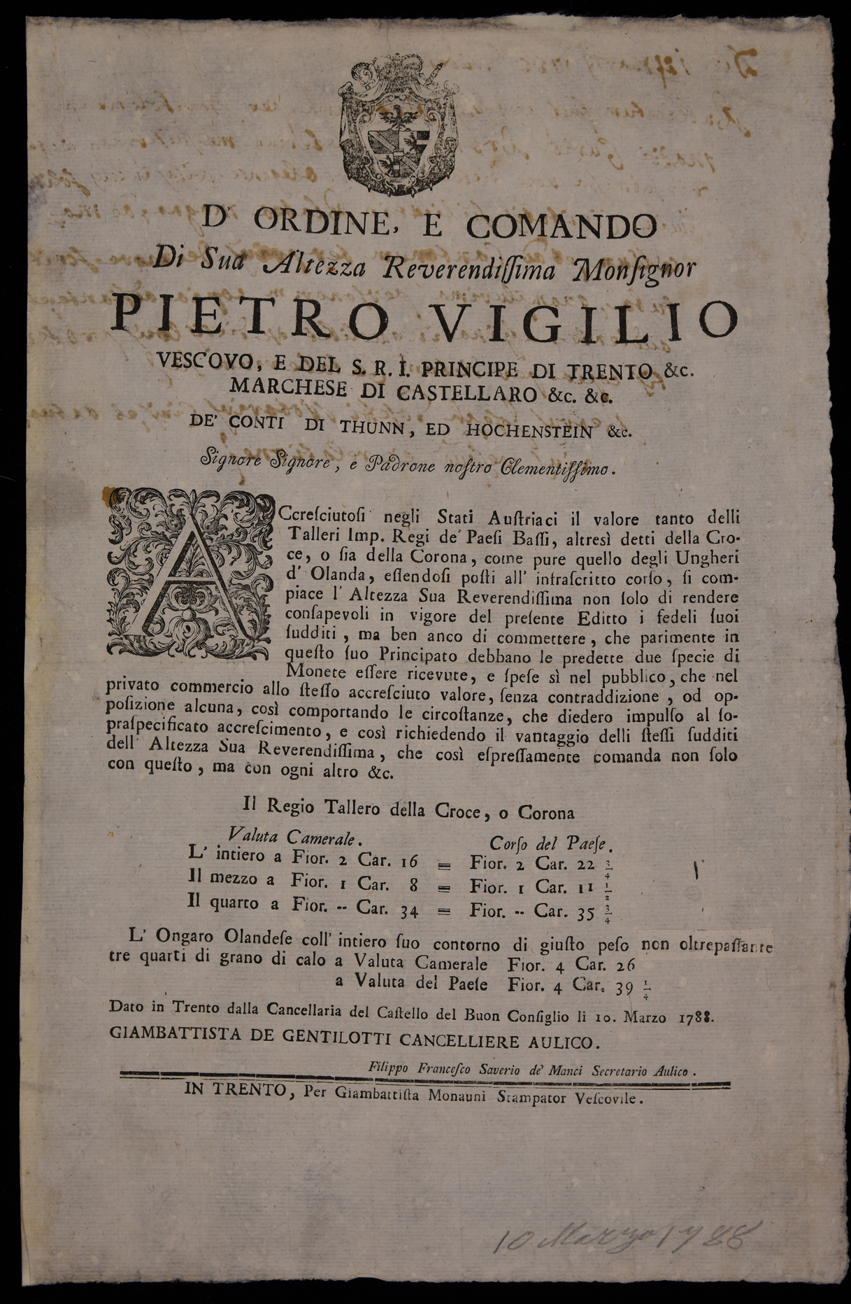 Proclama sul valore del regio tallero della croce e degli ungheri olandesi emanato il 10 marzo 1788 da Pietro Vigilio Thun, principe-vescovo di Trento, stemma di Pietro Vigilio Thun.