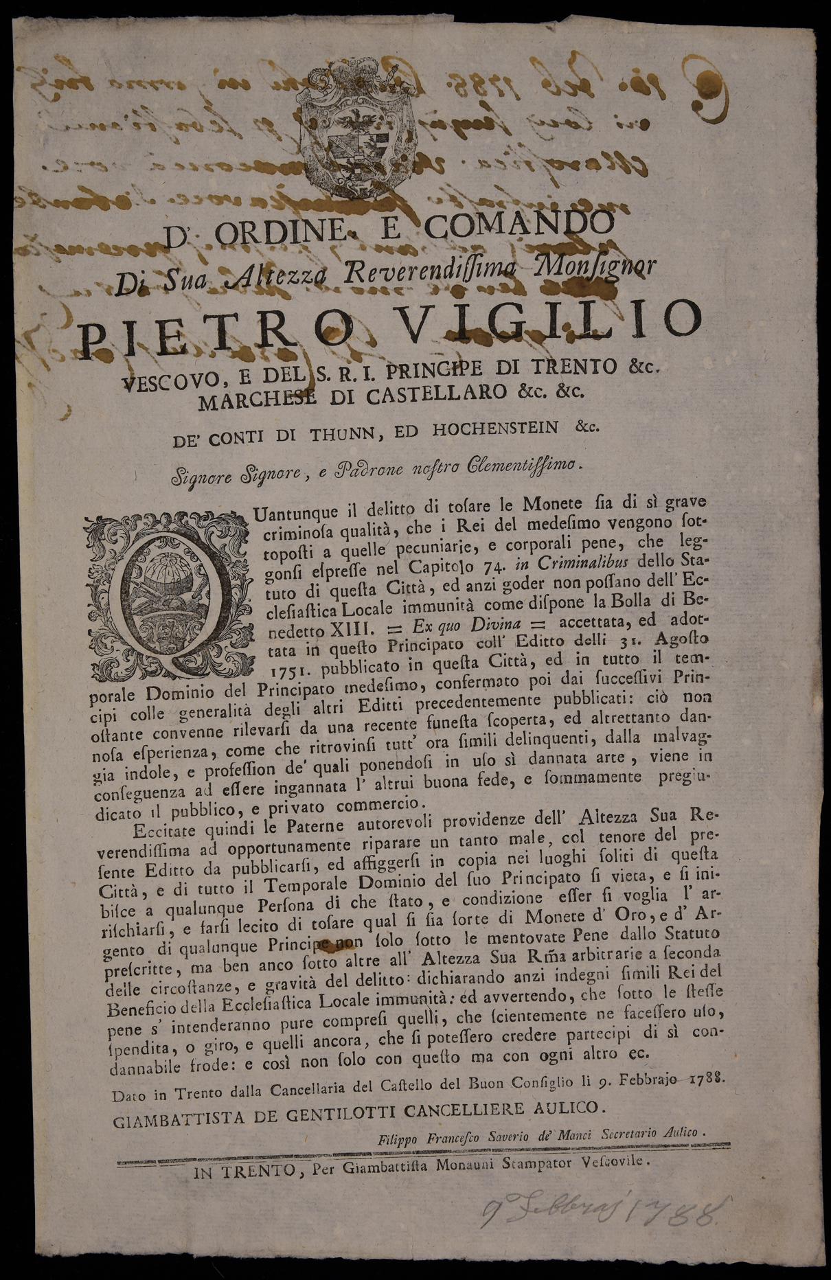 Proclama sulla tosatura delle monete d'oro e d'argento emanato il 9 febbraio 1788 da Pietro Vigilio Thun, principe-vescovo di Trento, stemma di Pietro Vigilio Thun.