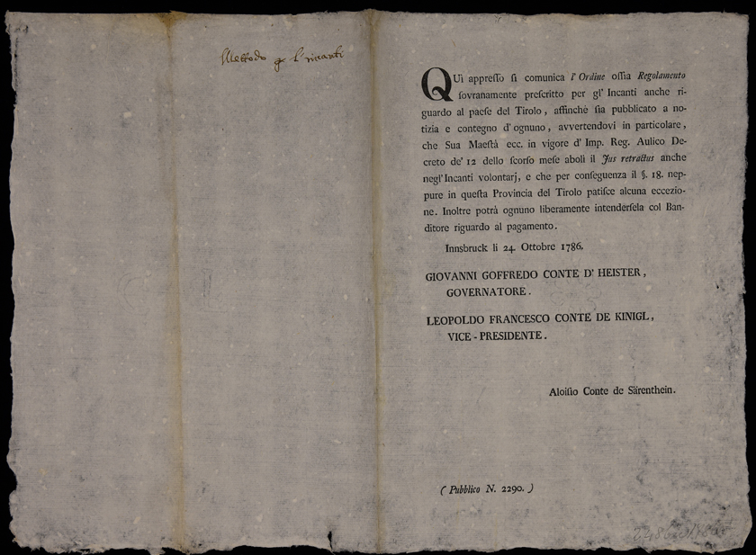 | Qui appresso si comunica l'ordine ossia regolamento sovranamente prescritto per gl' incanti ... |