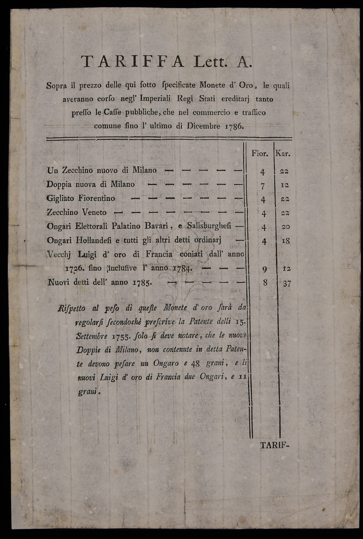 | Tariffa lett. A sopra il prezzo delle qui sotto specificate monete d'oro ... |