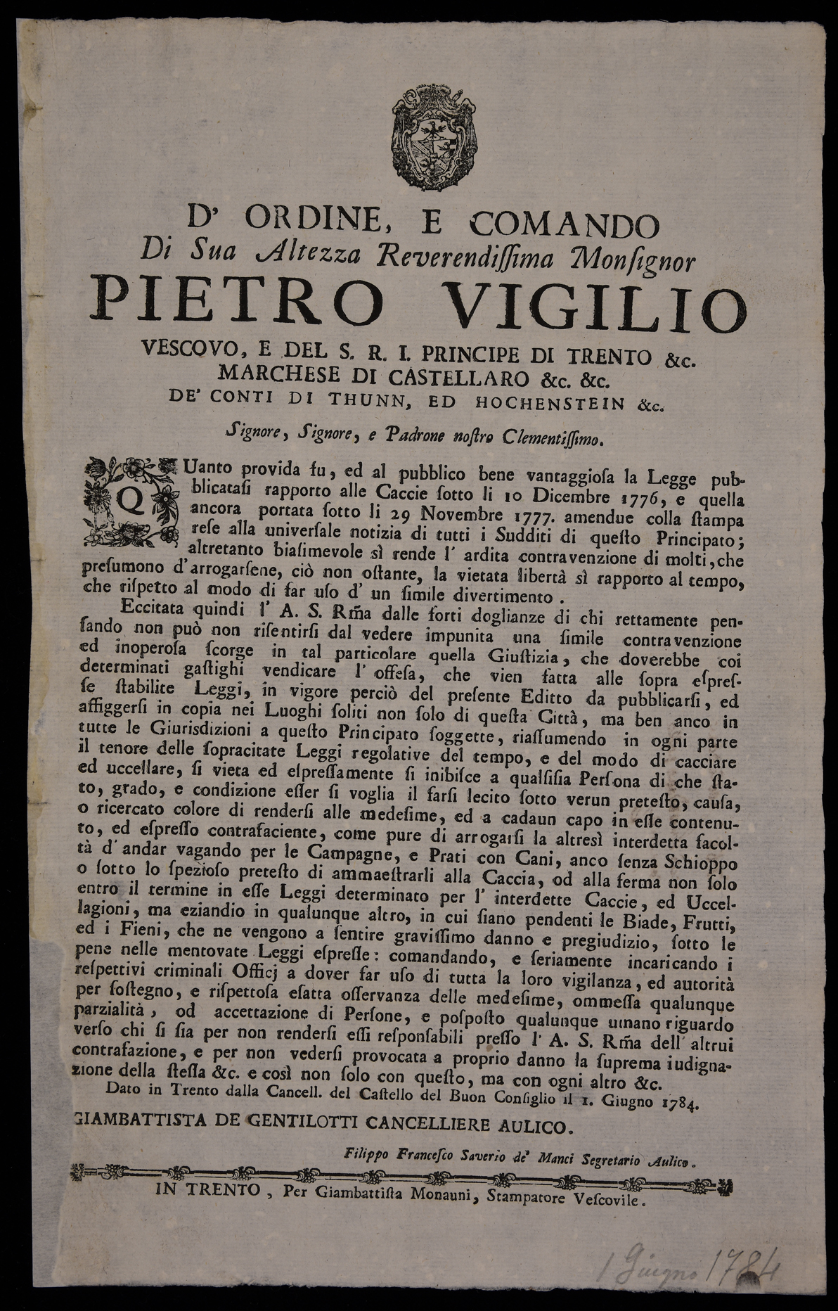 | D'ordine e comando di sua altezza reverendissima monsignor Pietro Vigilio vescovo e del S.R.I. principe di Trento &c. marchese di Castellaro &c. &c. de' conti di Thunn, ed Hoechenstein &c. signore, signore, e padrone nostro clementissimo |