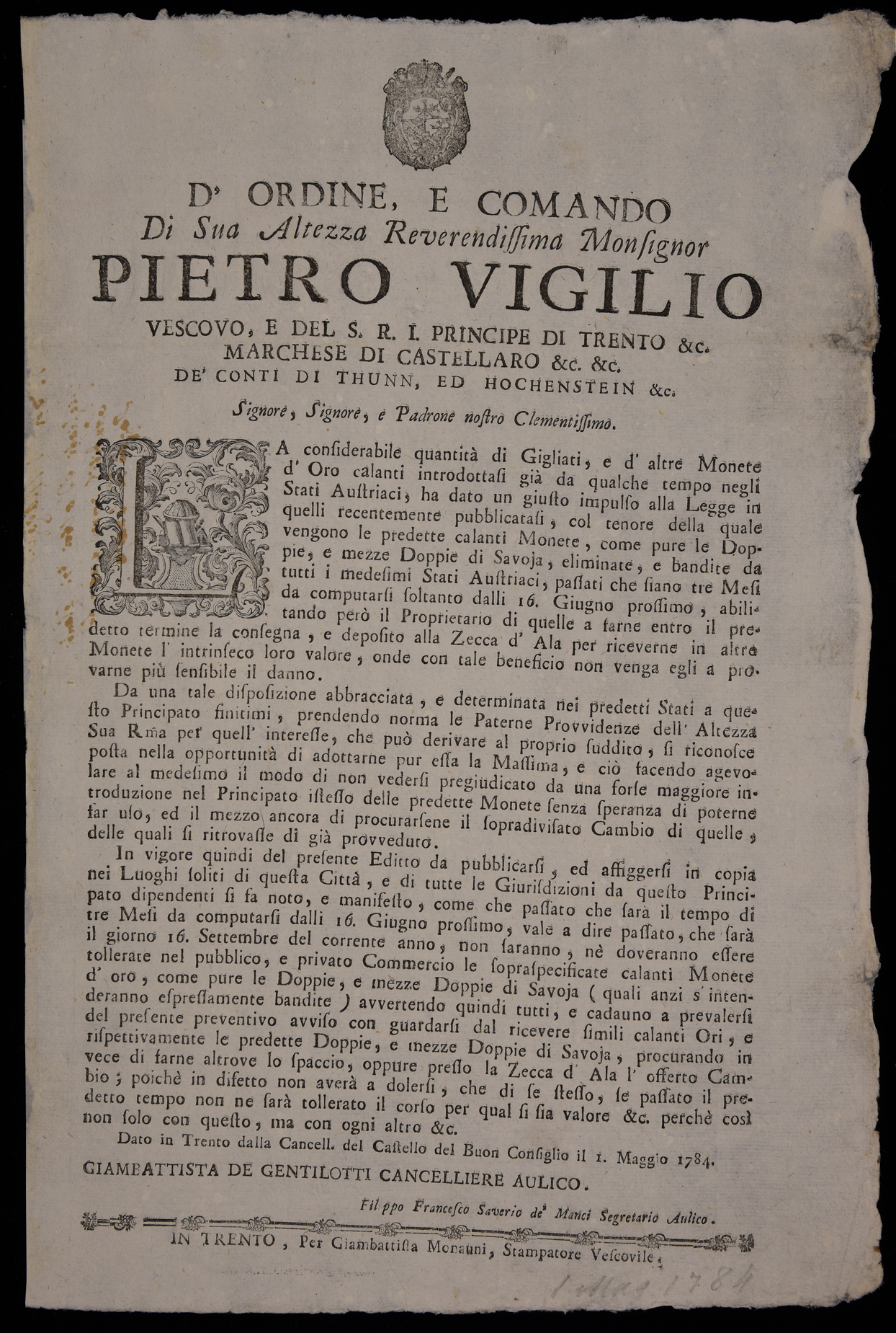 Proclama sul divieto di circolazione per le monete d'oro calanti, le doppie e mezze doppie di Savoia emanato il 1 maggio 1784 da Pietro Vigilio Thun, principe-vescovo di Trento, stemma di Pietro Vigilio Thun.