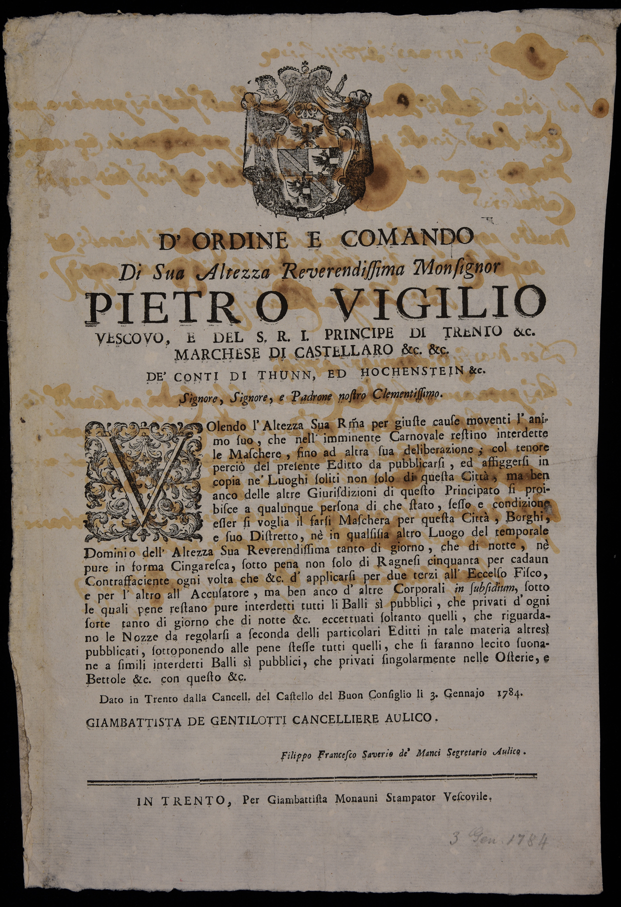 Proclama sul divieto di maschere e balli durante il carnevale emanato il 3 gennaio 1784 da Pietro Vigilio Thun, principe-vescovo di Trento, stemma di Pietro Vigilio Thun.