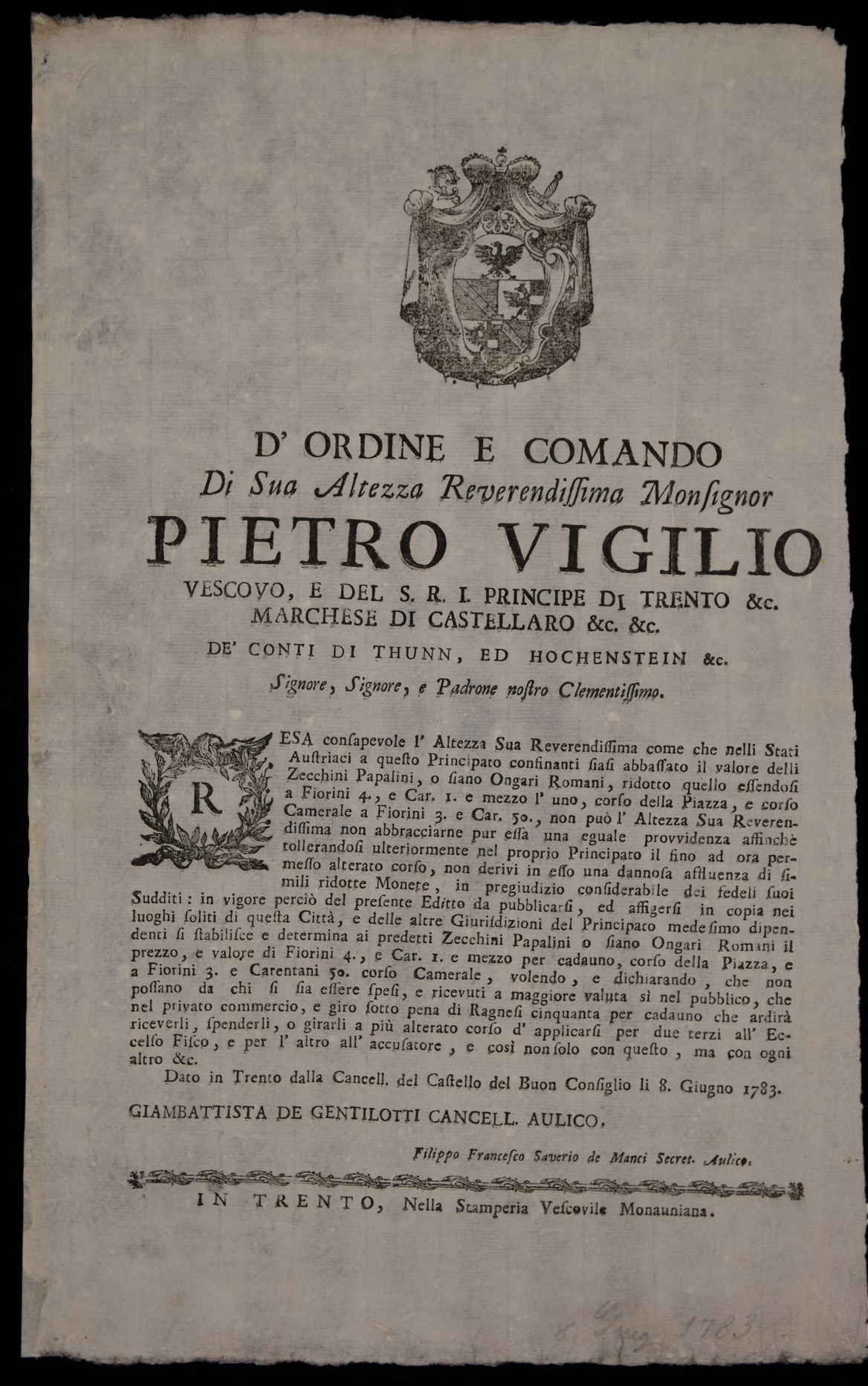 Proclama sul valore degli zecchini papalini emanato l'8 giugno 1783 da Pietro Vigilio Thun, principe-vescovo di Trento, stemma di Pietro Vigilio Thun.