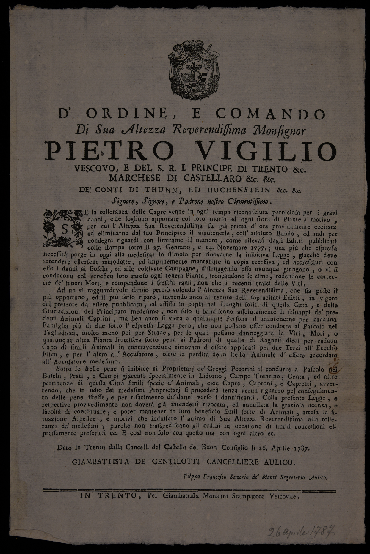 Proclama sui danni arrecati alle piante dalle capre emanato il 26 aprile 1787 da Pietro Vigilio Thun, principe-vescovo di Trento, stemma di Pietro Vigilio Thun.