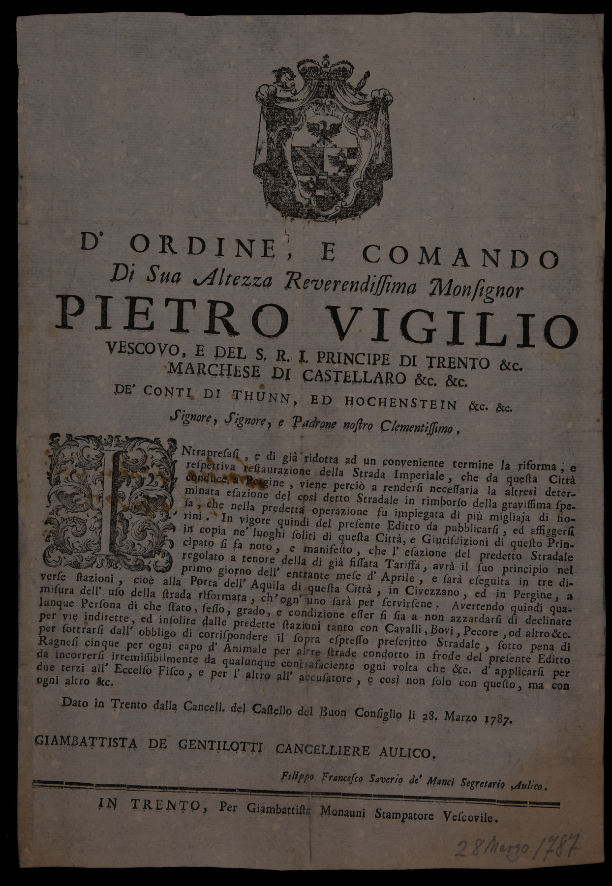 | D'ordine e comando di sua altezza reverendissima monsignor Pietro Vigilio vescovo e del S.R.I. principe di Trento &c. marchese di Castellaro &c. &c. de' conti di Thunn ed Hoechenstein &c. &c. signore, signore, e padrone nostro clementissimo |