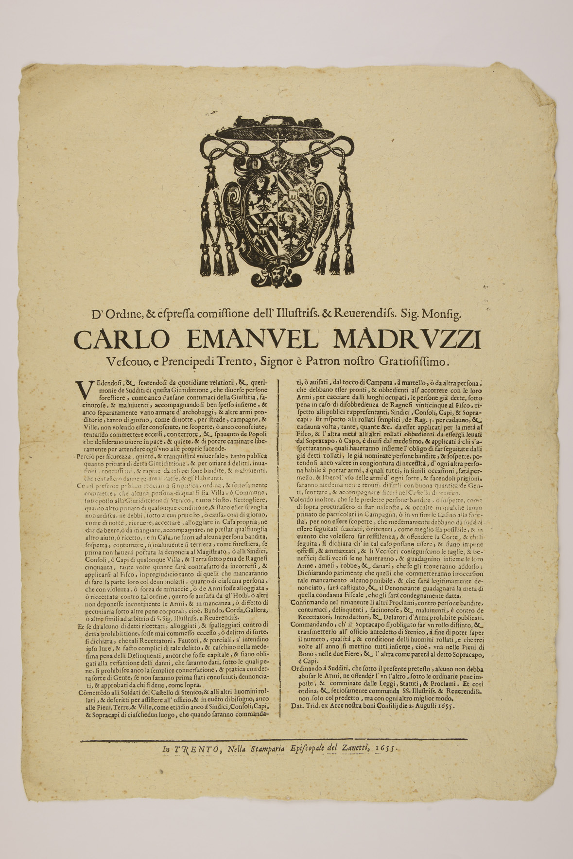 Proclama sui banditi e l’uso delle armi emanato il 2 agosto 1655 da Carlo Emmanuele Madruzzo, principe-vescovo di Trento