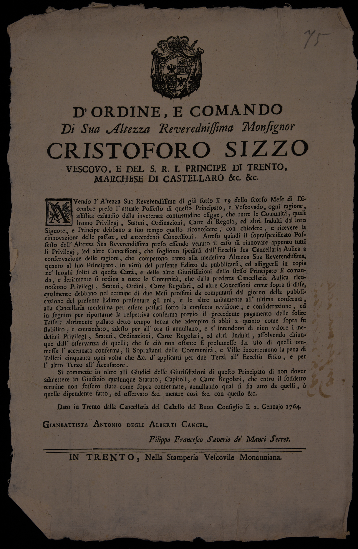 1 manifesto. Proclama sul rinnovo delle concessioni alle comunità emanato il 2 gennaio 1764 da Cristoforo Sizzo, principe-vescovo di Trento, stemma di Cristoforo Sizzo