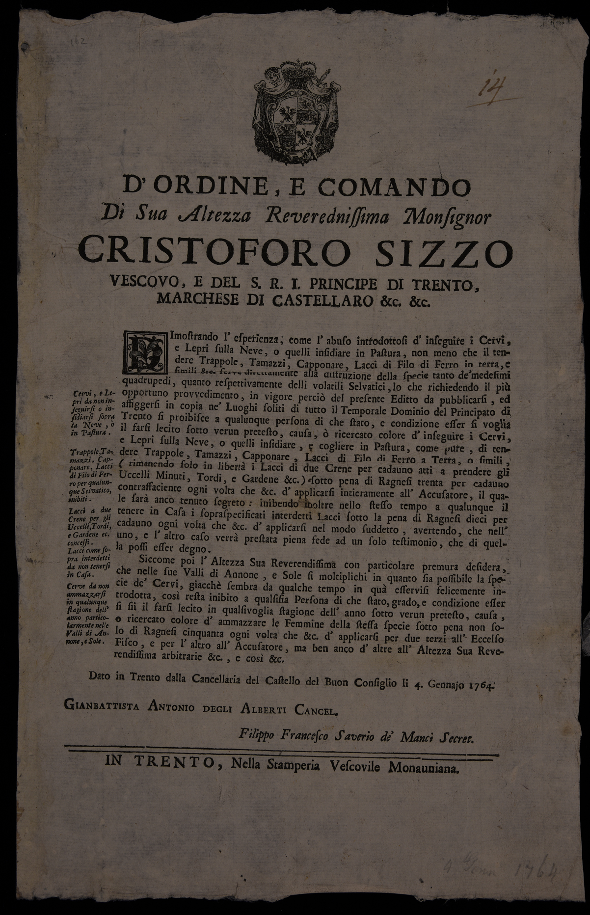 1 manifesto. Proclama sulla limitazione della caccia emanato il 4 gennaio 1764 da Cristoforo Sizzo, principe-vescovo di Trento, stemma di Cristoforo Sizzo