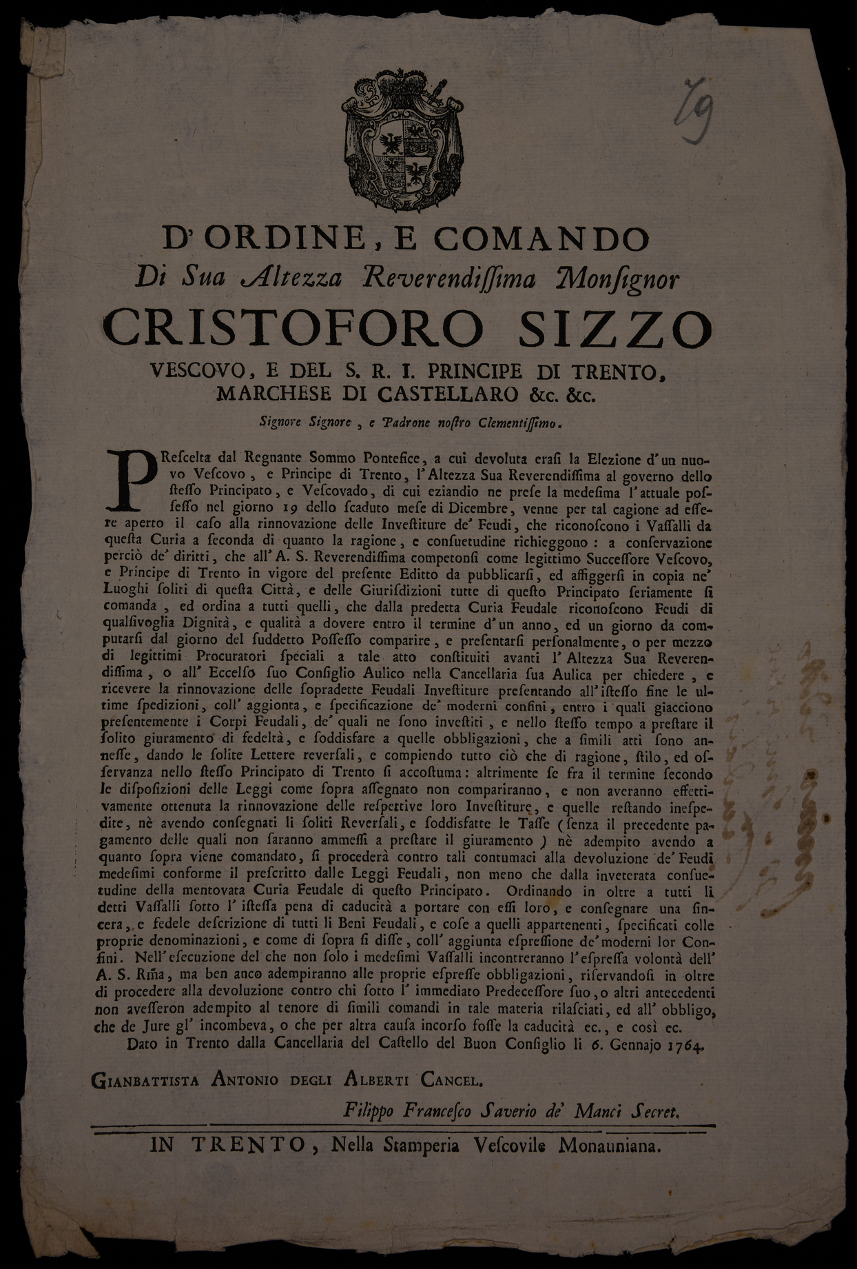 | D'ordine e comando di sua altezza reverendissima monsignor Cristoforo Sizzo vescovo e del S.R.I. principe di Trento, marchese di Castellaro &c. &c. signore signore, e padrone nostro clementissimo |