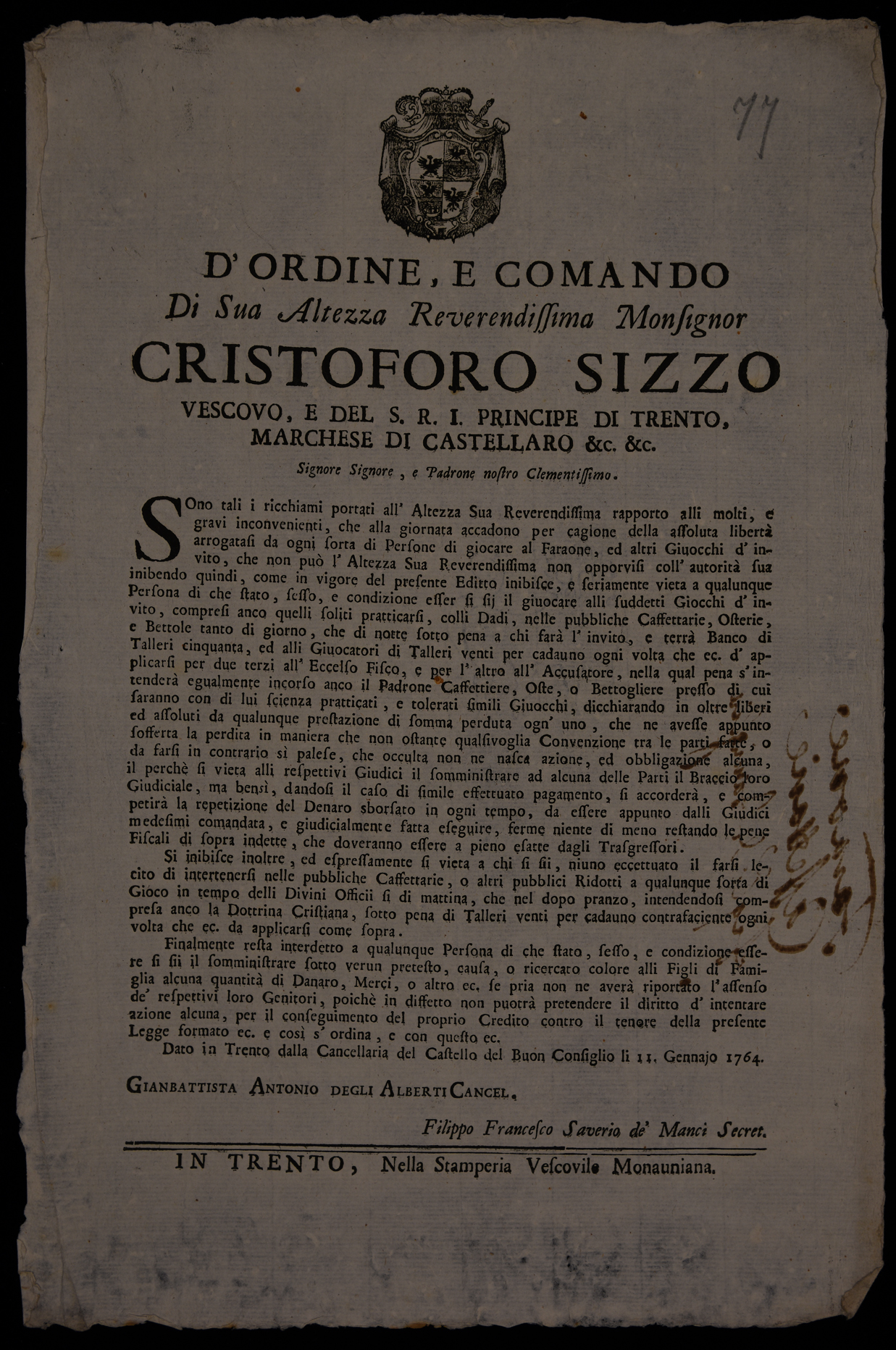1 manifesto. Proclama sui giochi d'azzardo emanato l'11 gennaio 1764 da Cristoforo Sizzo, principe-vescovo di Trento, stemma di Cristoforo Sizzo