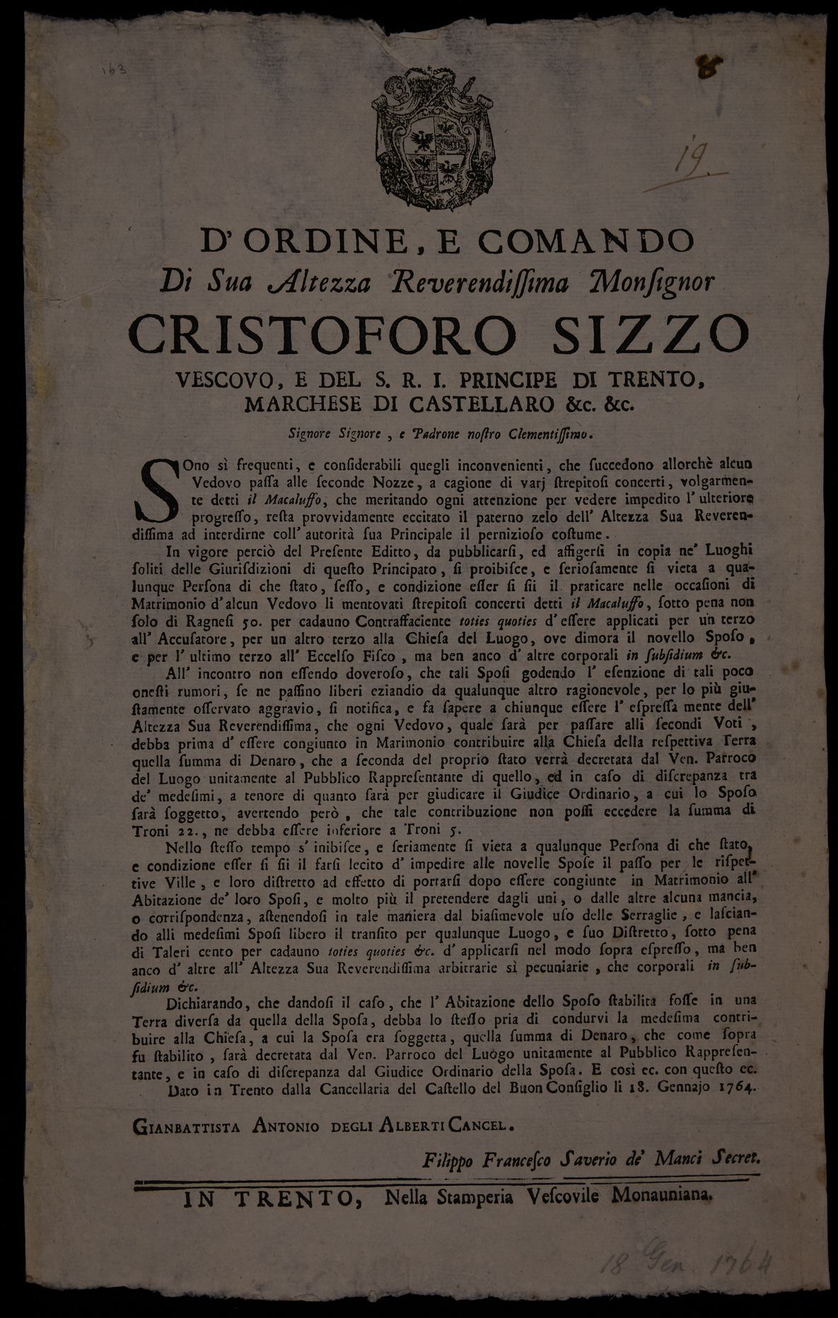 | D'ordine e comando di sua altezza reverendissima monsignor Cristoforo Sizzo vescovo e del S.R.I. principe di Trento, marchese di Castellaro &c. &c. signore signore, e padrone nostro clementissimo |