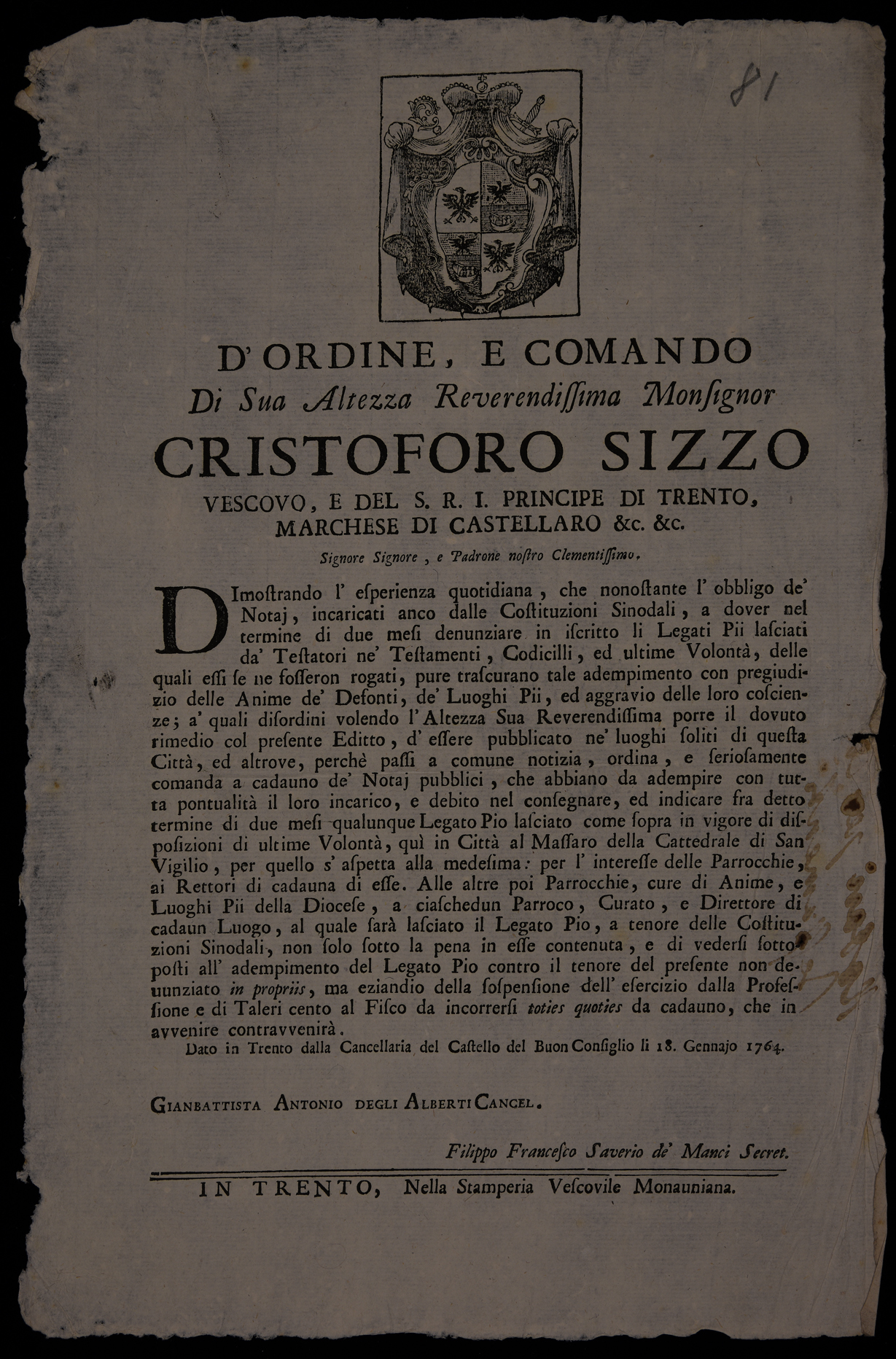 1 manifesto. Proclama sui legati pii emanato il 18 gennaio 1764 da Cristoforo Sizzo, principe-vescovo di Trento, stemma di Cristoforo Sizzo
