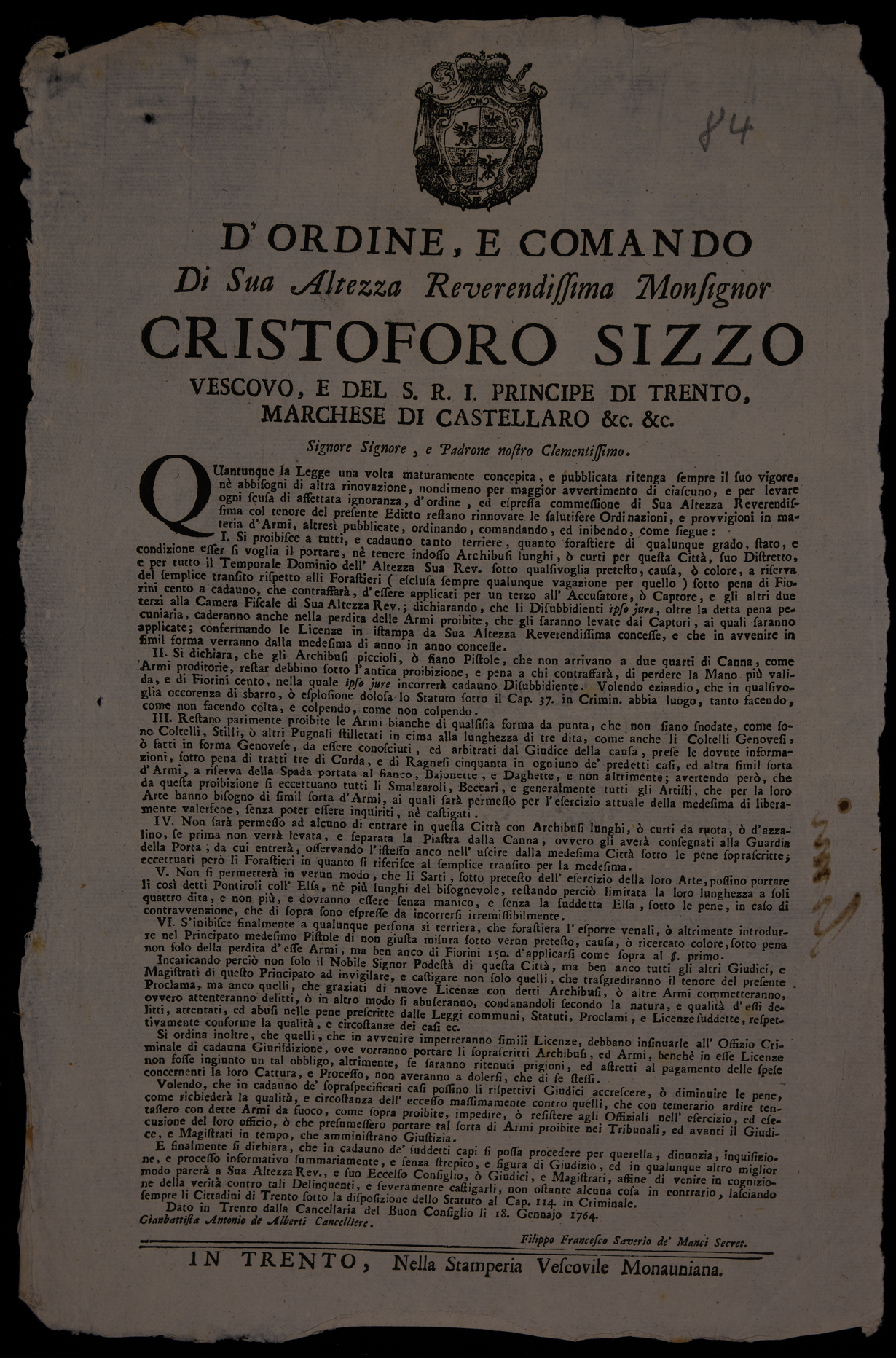 | D'ordine e comando di sua altezza reverendissima monsignor Cristoforo Sizzo vescovo e del S.R.I. principe di Trento, marchese di Castellaro &c. &c. signore signore, e padrone nostro clementissimo |