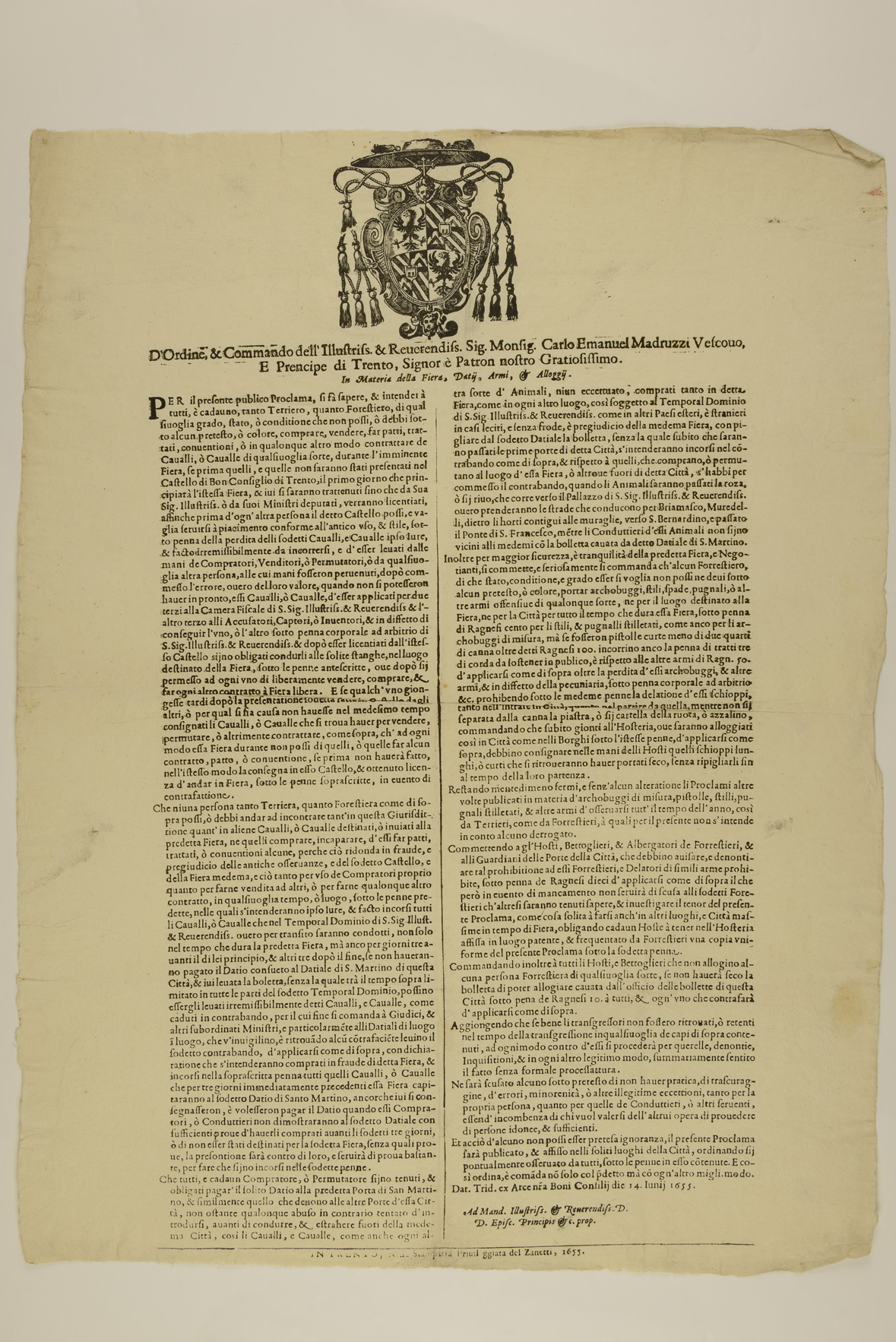 Proclama su fiere, dazi, armi e alloggi ai forestieri emanato il 14 giugno 1655 da Carlo Emmanuele Madruzzo, principe-vescovo di Trento
