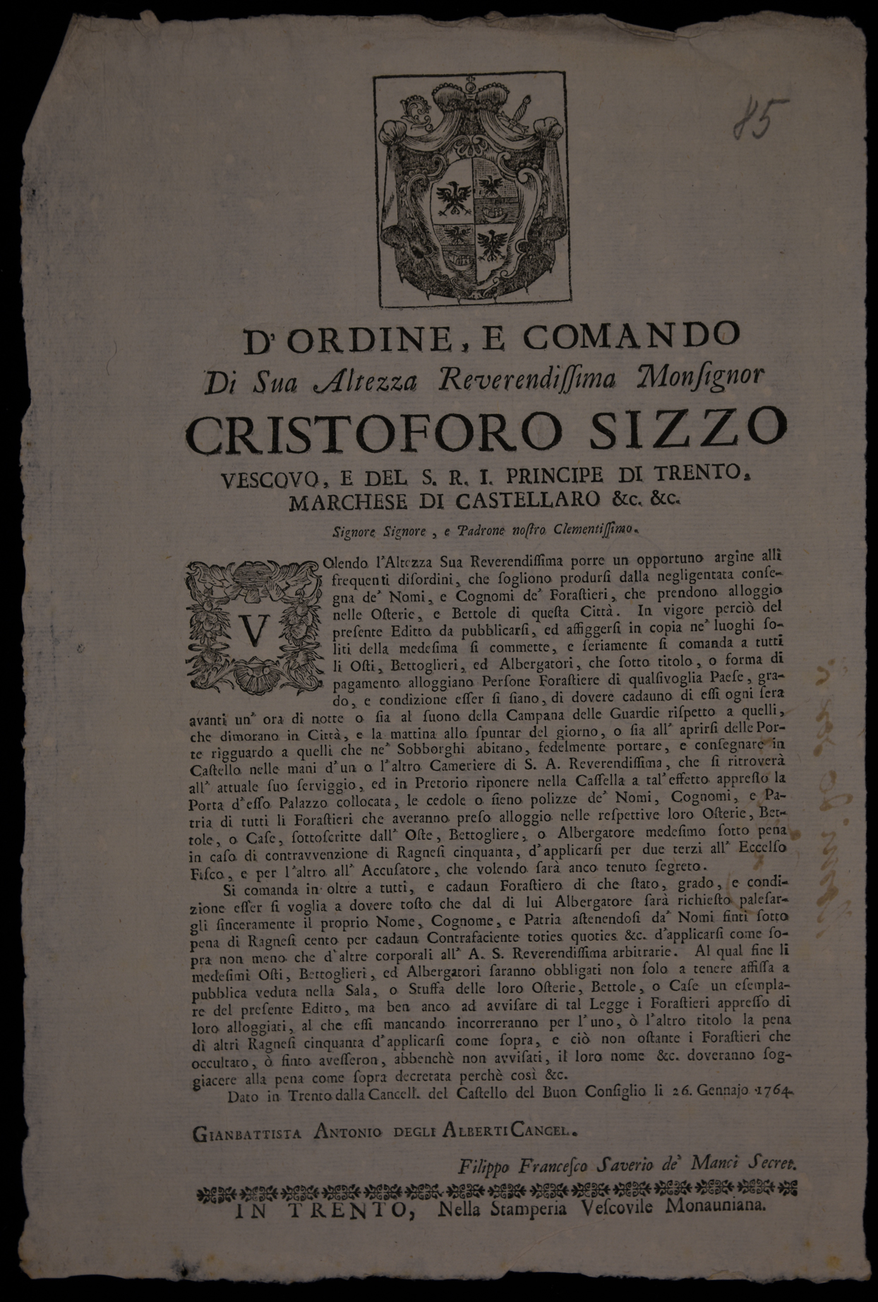 1 manifesto. Proclama che impone agli albergatori la registrazione dei clienti emanato il 26 gennaio 1764 da Cristoforo Sizzo, principe-vescovo di Trento, stemma di Cristoforo Sizzo