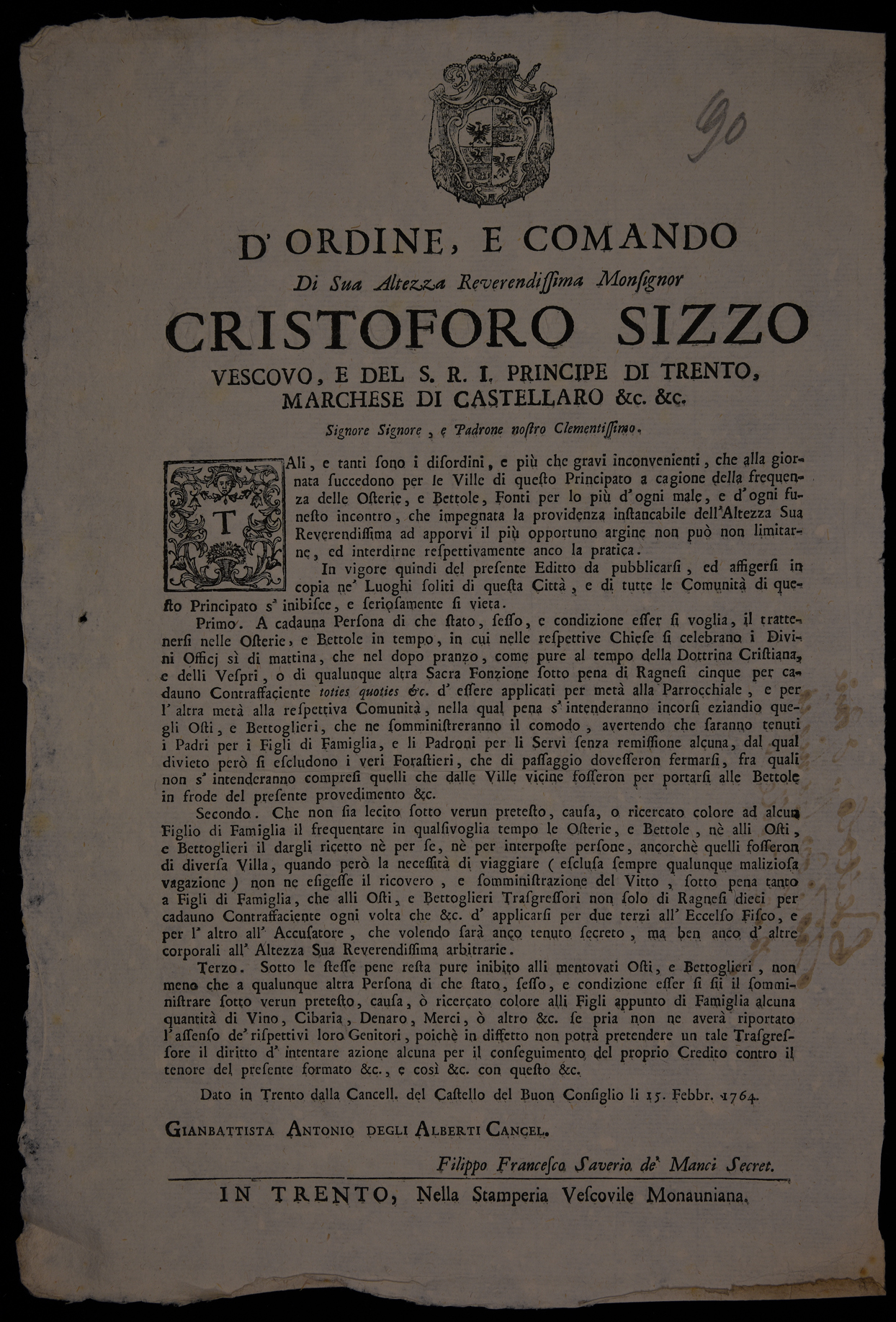 Proclama che limita la frequentazione delle osterie emanato il 15 febbraio 1764 da Cristoforo Sizzo, principe-vescovo di Trento, stemma di Cristoforo Sizzo