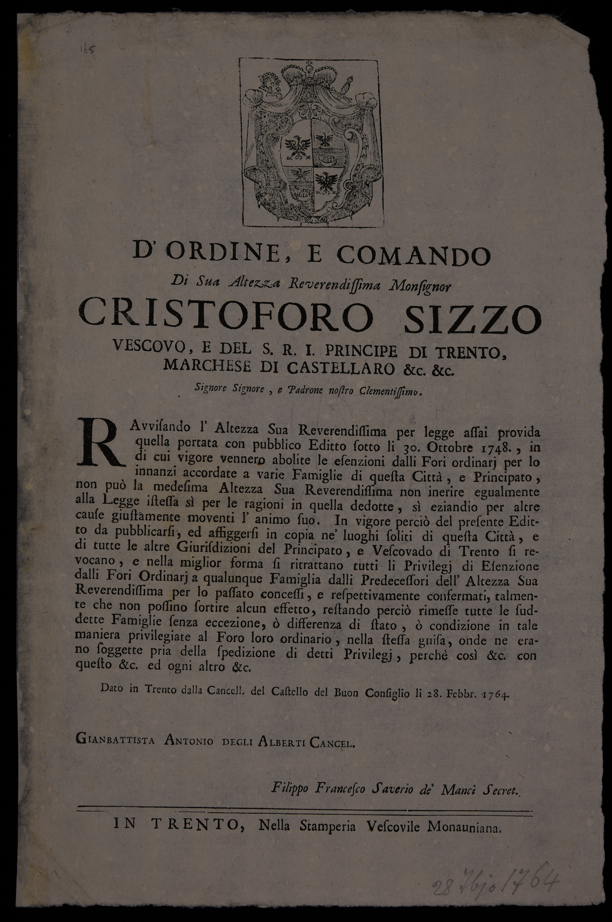 1 manifesto. Proclama che revoca alcuni privilegi concessi dai suoi predecessori emanato il 28 febbraio 1764 da Cristoforo Sizzo, principe-vescovo di Trento, stemma di Cristoforo Sizzo