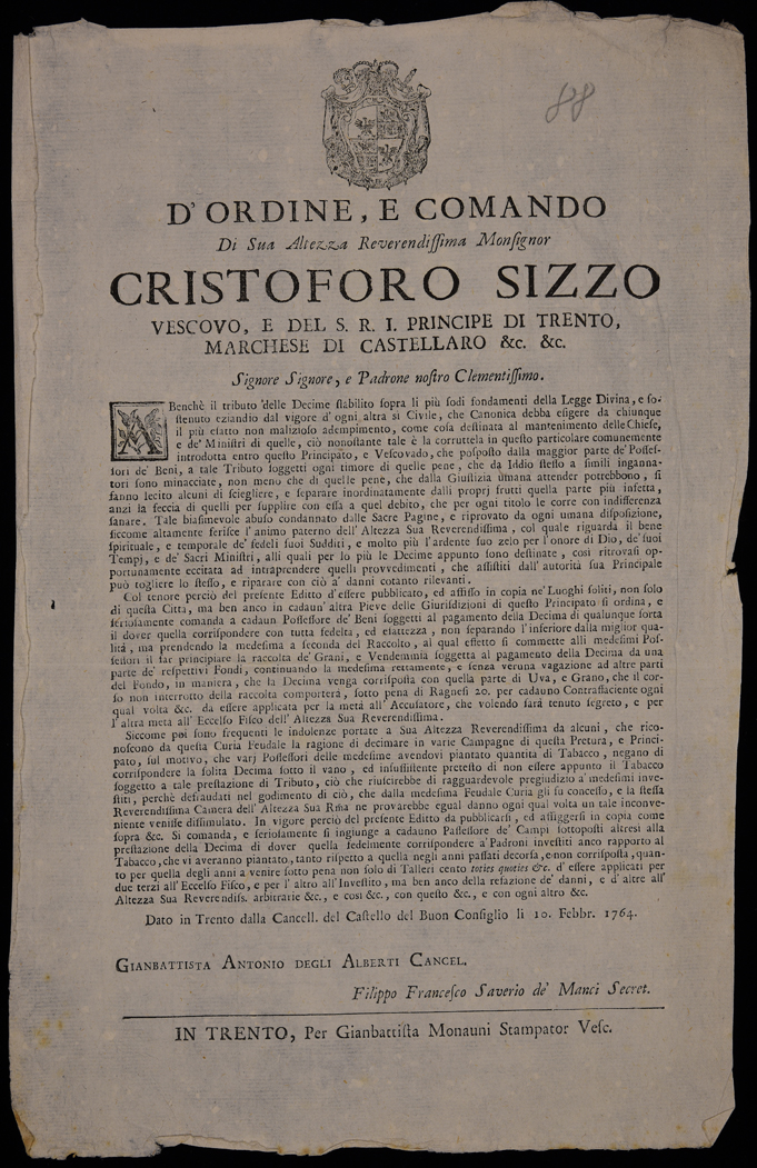 | D'ordine e comando di sua altezza reverendissima monsignor Cristoforo Sizzo vescovo e del S.R.I. principe di Trento, marchese di Castellaro &c. &c. signore signore, e padrone nostro Clementissimo |