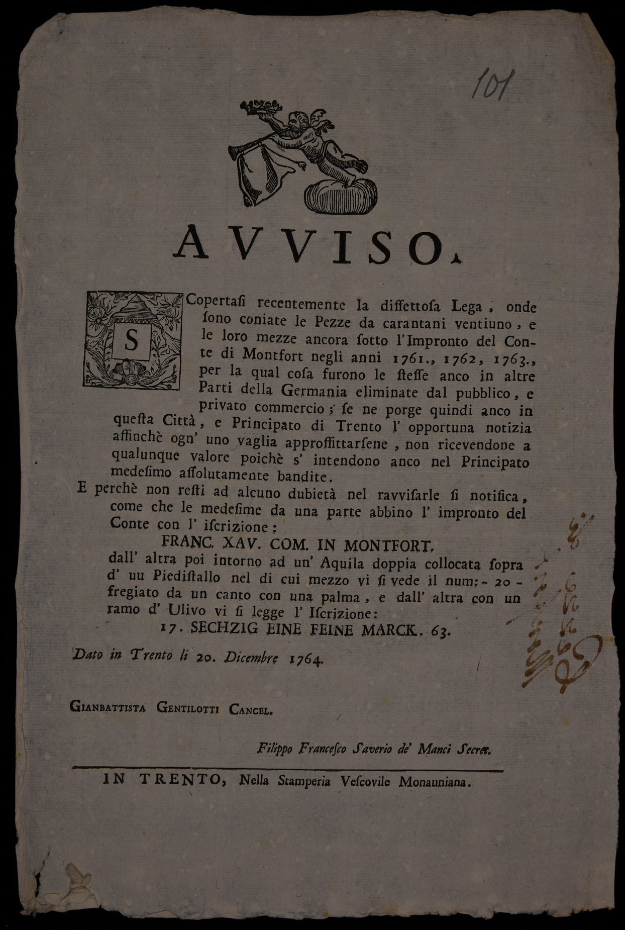 Scopertasi recentemente la diffettosa lega, onde sono coniate le pezze da carantani ventiuno ...