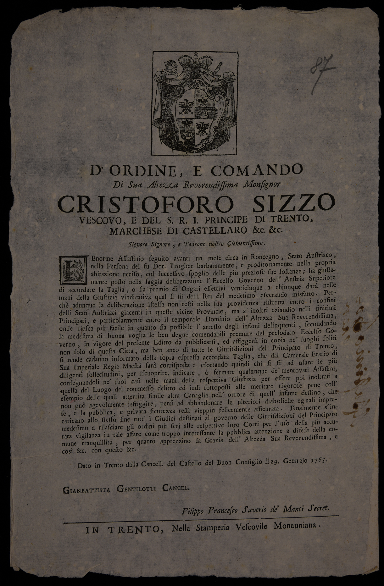 1 manifesto. Proclama sulla taglia imposta agli assassini del dott. Trogher emanato il 29 gennaio 1765 da Cristoforo Sizzo, principe-vescovo di Trento, stemma di Cristoforo Sizzo
