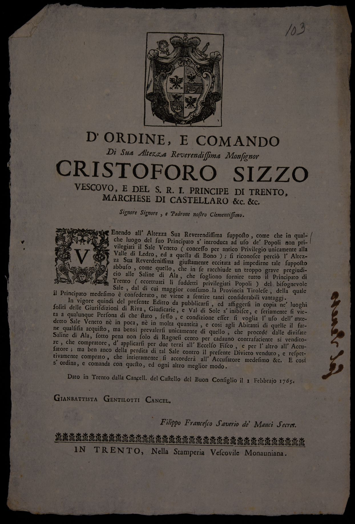 1 manifesto. Proclama che vieta l'introduzione del sale veneto nel principato (tranne che in Valle di Ledro e a Bono) emanato il 1 febbraio 1765 da Cristoforo Sizzo, principe-vescovo di Trento, stemma di Cristoforo Sizzo