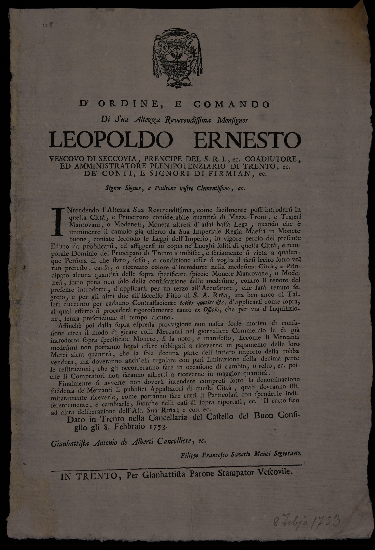 | D'ordine e comando di sua altezza reverendissima monsignor Leopoldo Ernesto vescovo di Seccovia, prencipe del S.R.I., ec. coadiutore, ed amministratore plenipotenziario di Trento, ec. de' conti, e signori di Firmian, ec. signor signor, e padrone nostro clementissimo, ec. |