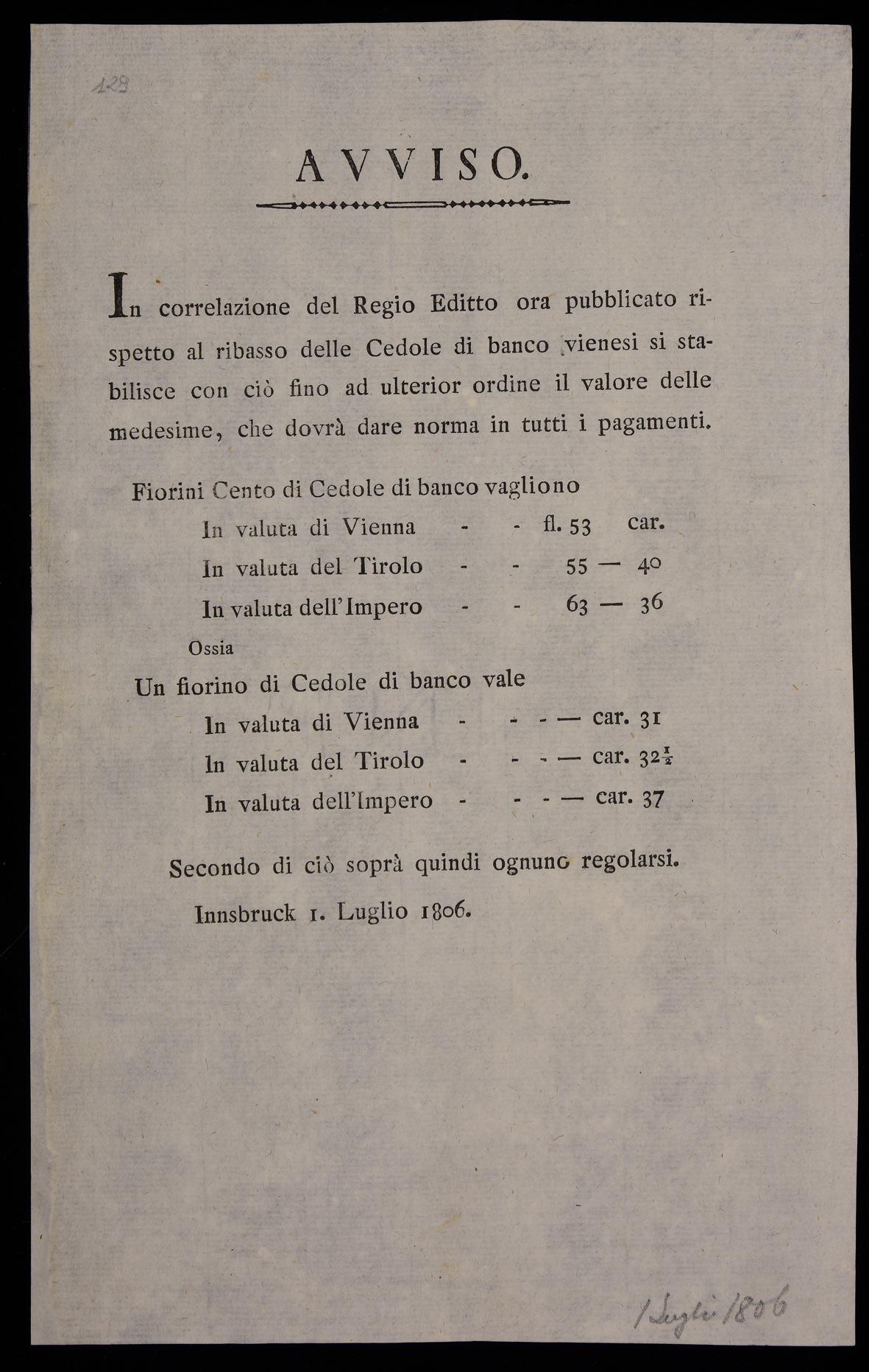 in correlazione del Regio Editto ora pubblicato rispetto al ribasso delle Cedole di banco vienesi ...