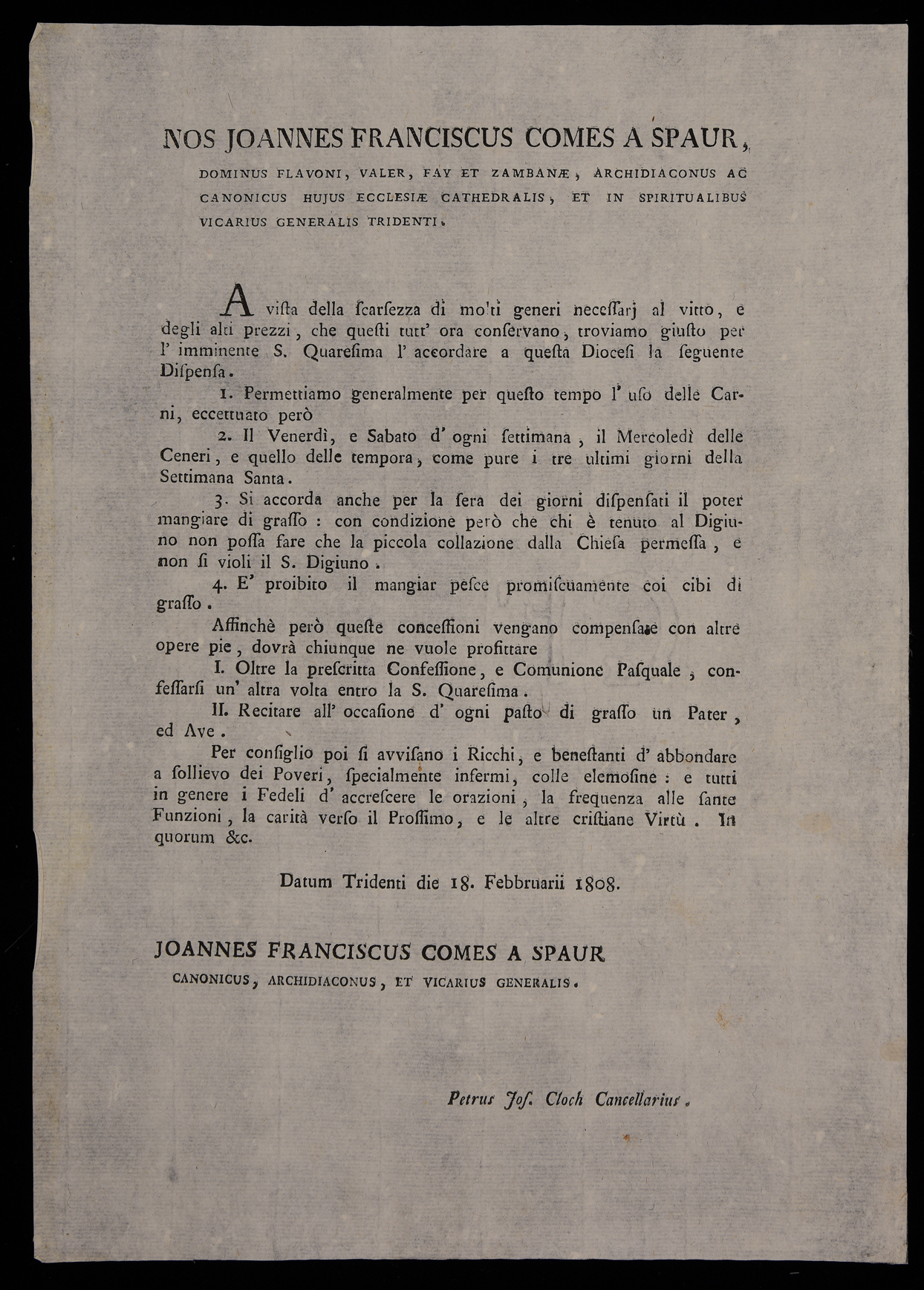 Proclama di Giovanni Francesco Spaur sul permesso di mangiare carne durante la quaresima, emanato il 18 febbraio 1808, sottoscritto da Giovanni Francesco Spaur e Pietro Giuseppe Cloch