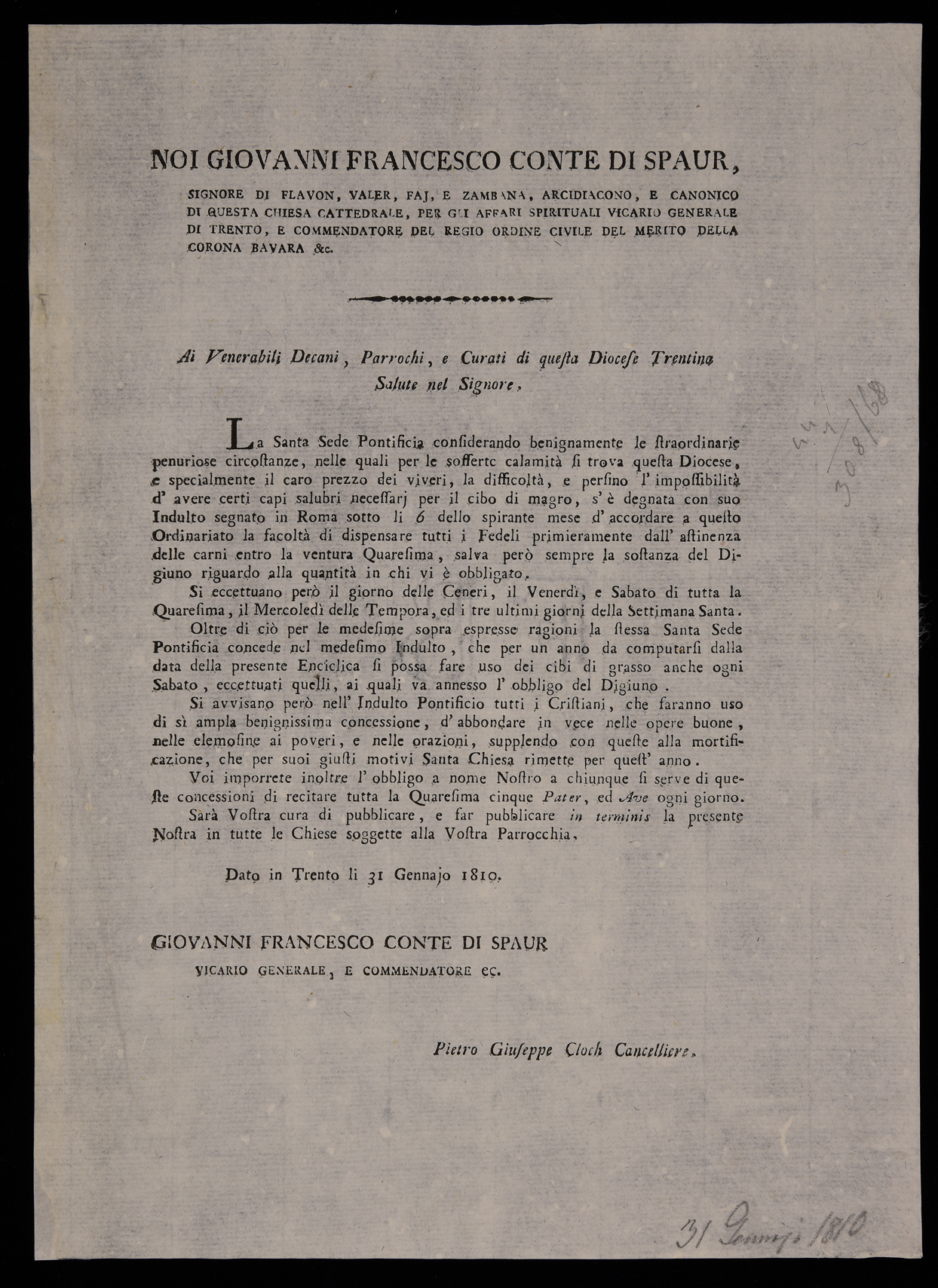 Proclama di Giovanni Francesco Spaur sul permesso di mangiare carne durante la quaresima, emanato il 18 febbraio 1808, sottoscritto da Giovanni Francesco Spaur e Pietro Giuseppe Cloch
