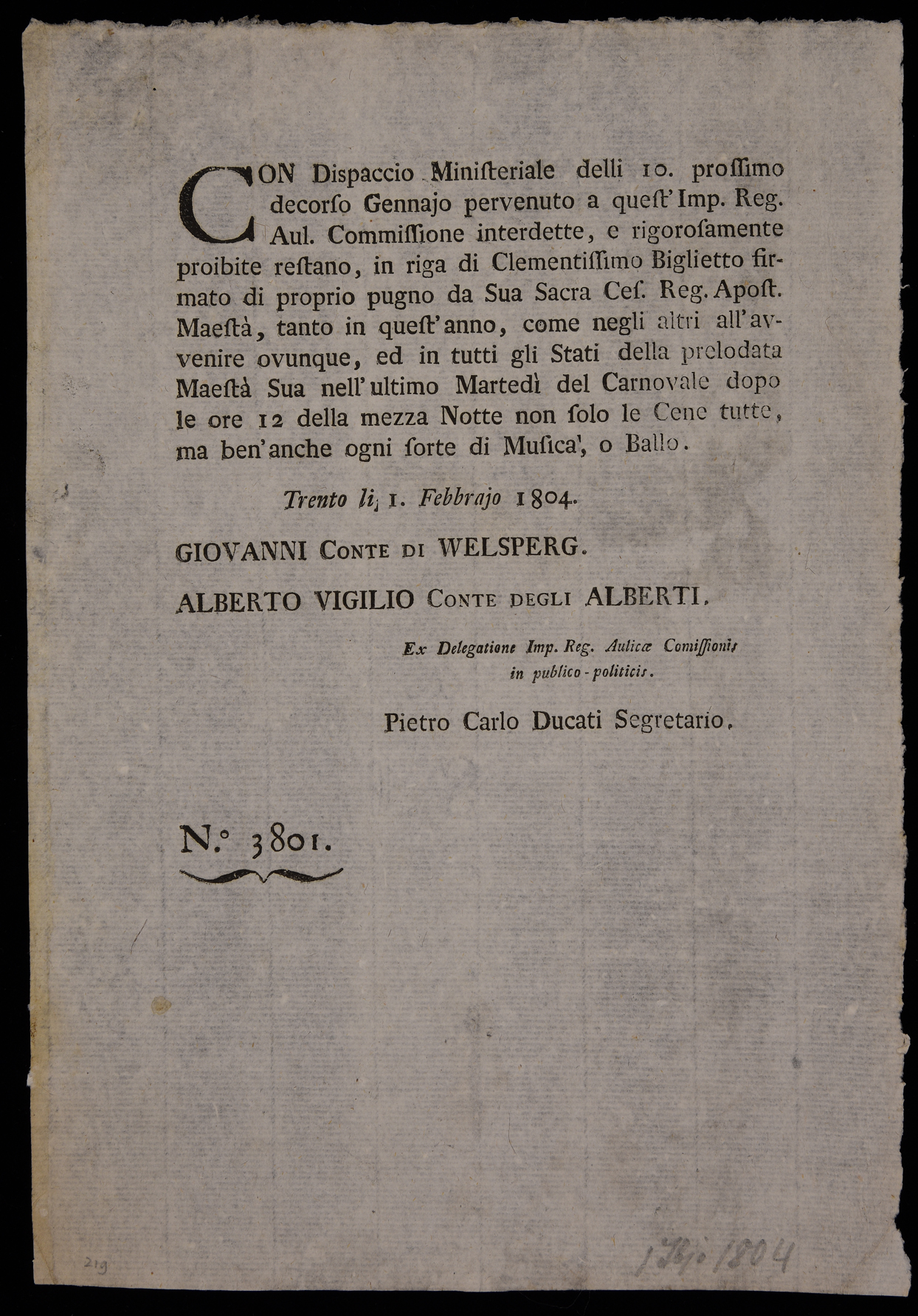 Proclama dell'Imperiale Regia delegazione pubblico-politica sul divieto tenere cene, balli e feste musicali dopo le ore dodici di martedì grasso, emanato il 1 febbraio 1804, sottoscritto da Giovanni Welsperg, Alberto Vigilio Alberti e Pietro Carlo Ducati