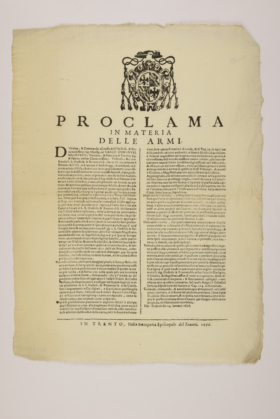 Proclama sulle armi emanato il 24 gennaio 1656 da Carlo Emmanuele Madruzzo, principe-vescovo di Trento