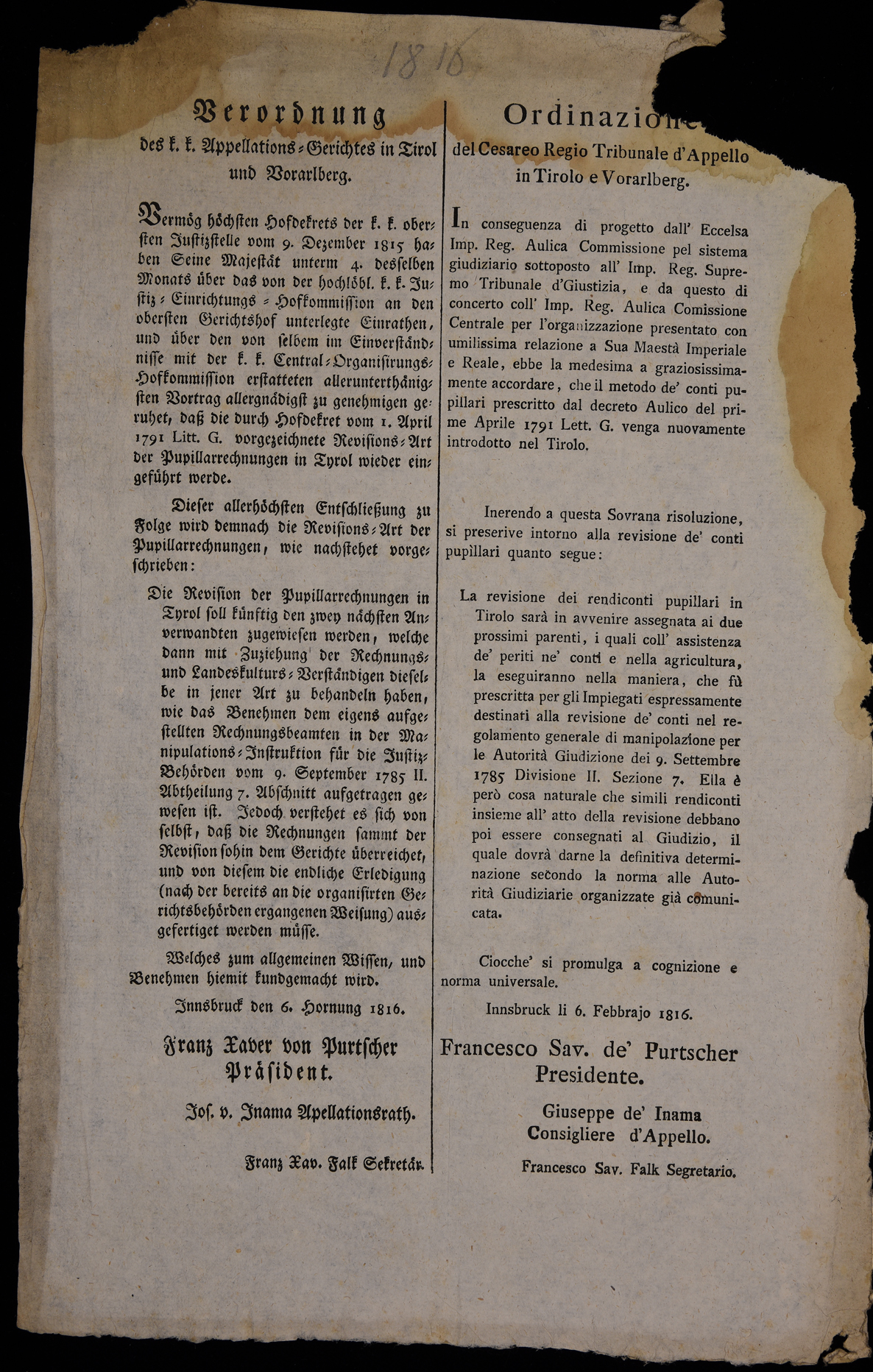 Proclama del Cesareo Regio Tribunale d'Appello in Tirolo e Vorarlberg sulla reintroduzione dei conti pupillari, emanato il 6 febbraio 1816, sottoscritto da Franz Xaver Purtscher (presidente), Giuseppe Inama (consigliere d'appello), Franz Xaver Falk (segretario)
