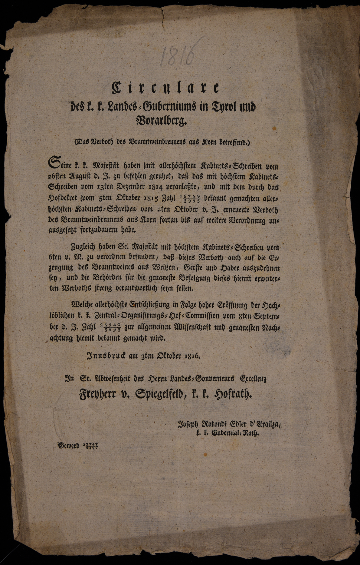 | Circulare des k.k. Landes-Guberniums in Tyrol und Vorarlberg (Das Verboth des Branntweinbrennens aus Korn betreffend) |