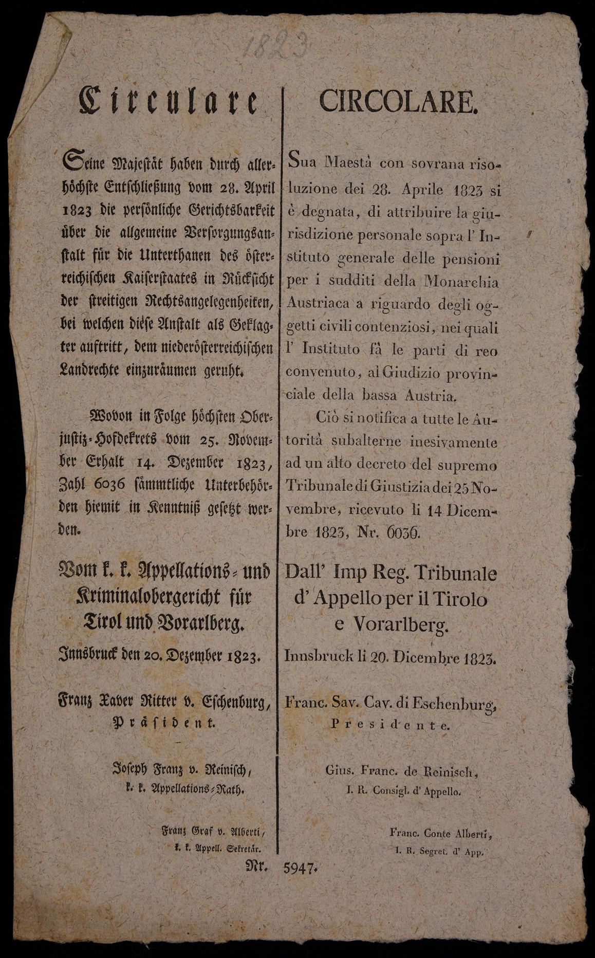 Proclama dell'Imperial Regio Tribunale d'Appello per il Tirolo ed il Vorarlberg che attribuisce la giurisdizione personale sull'Istituto generale delle pensioni, in materia di oggetti civili contenziosi, al Giudizio provinciale della Bassa Austria, emanato il 20 dicembre 1823, sottoscritto da Franz Xavier Eschenburg, Joseph Franz von Reinisch, Fracesco Alberti, testo tedesco e italiano su due colonne, numero di protocollo 5947.